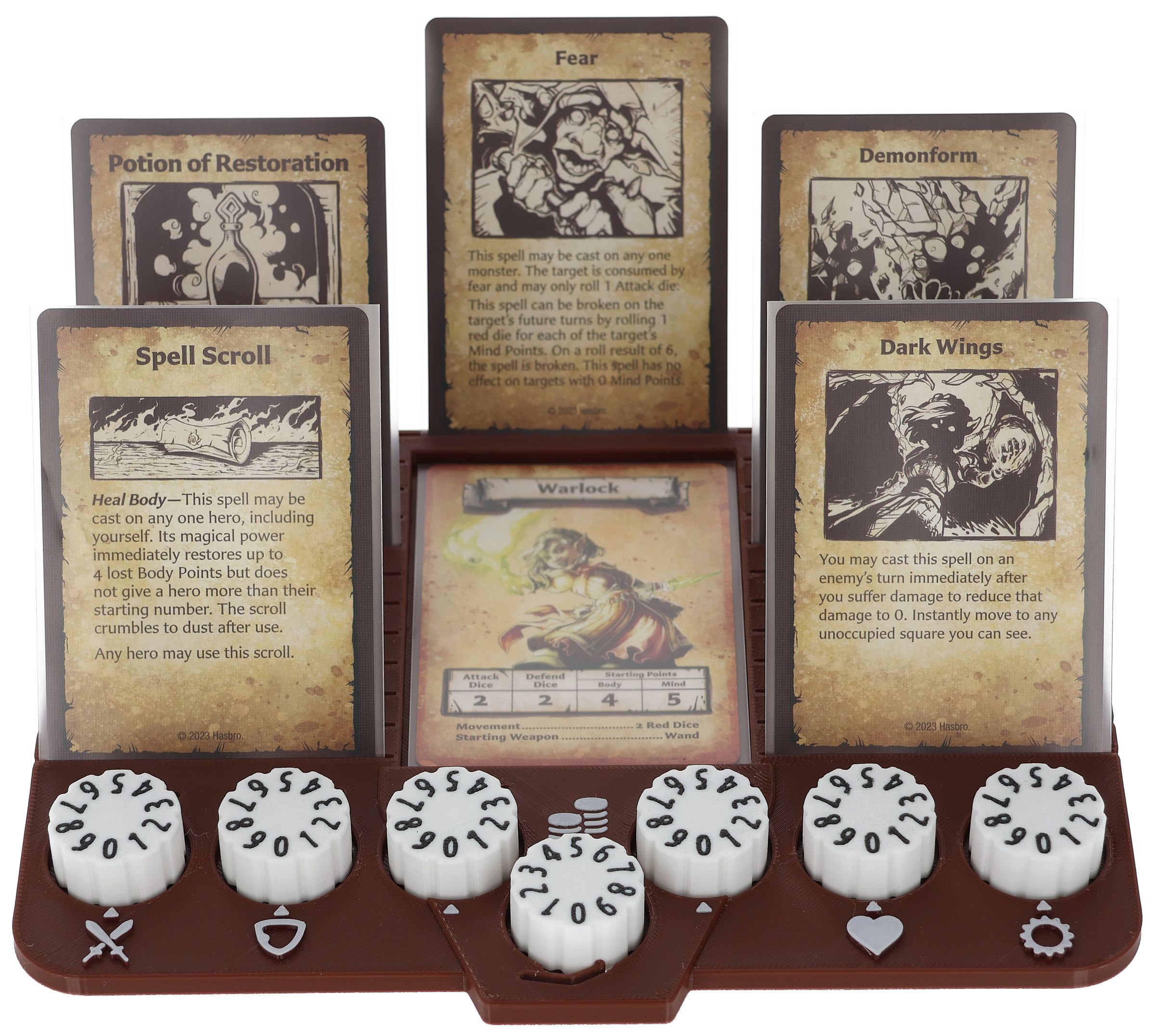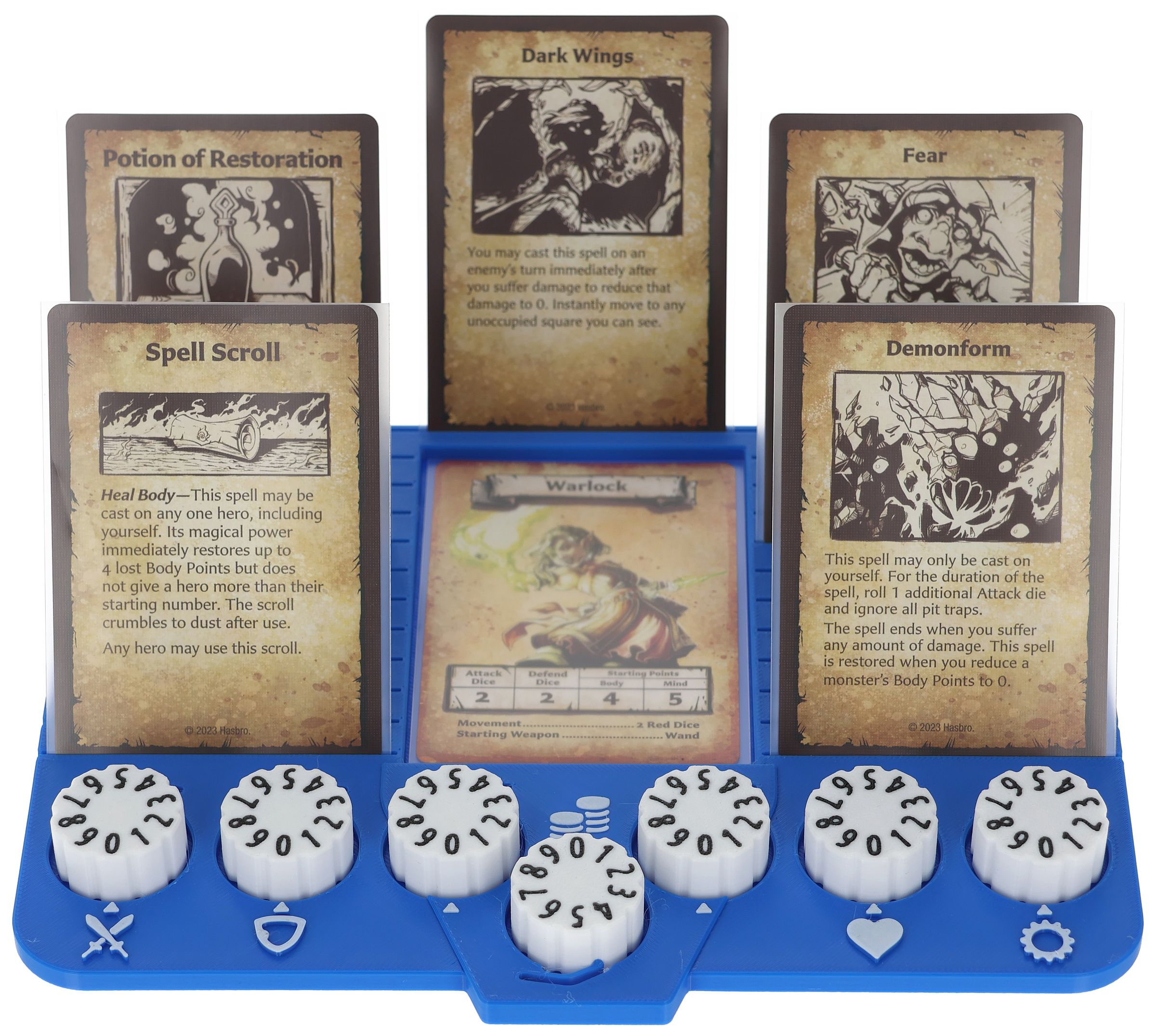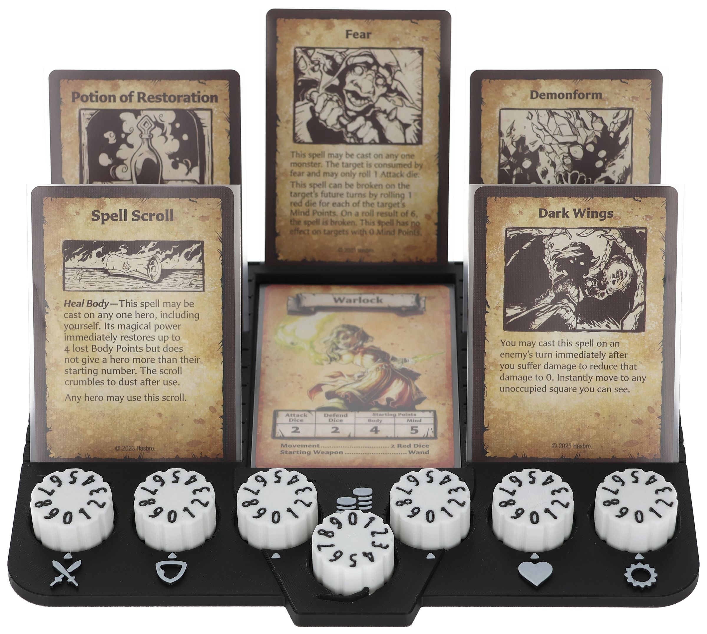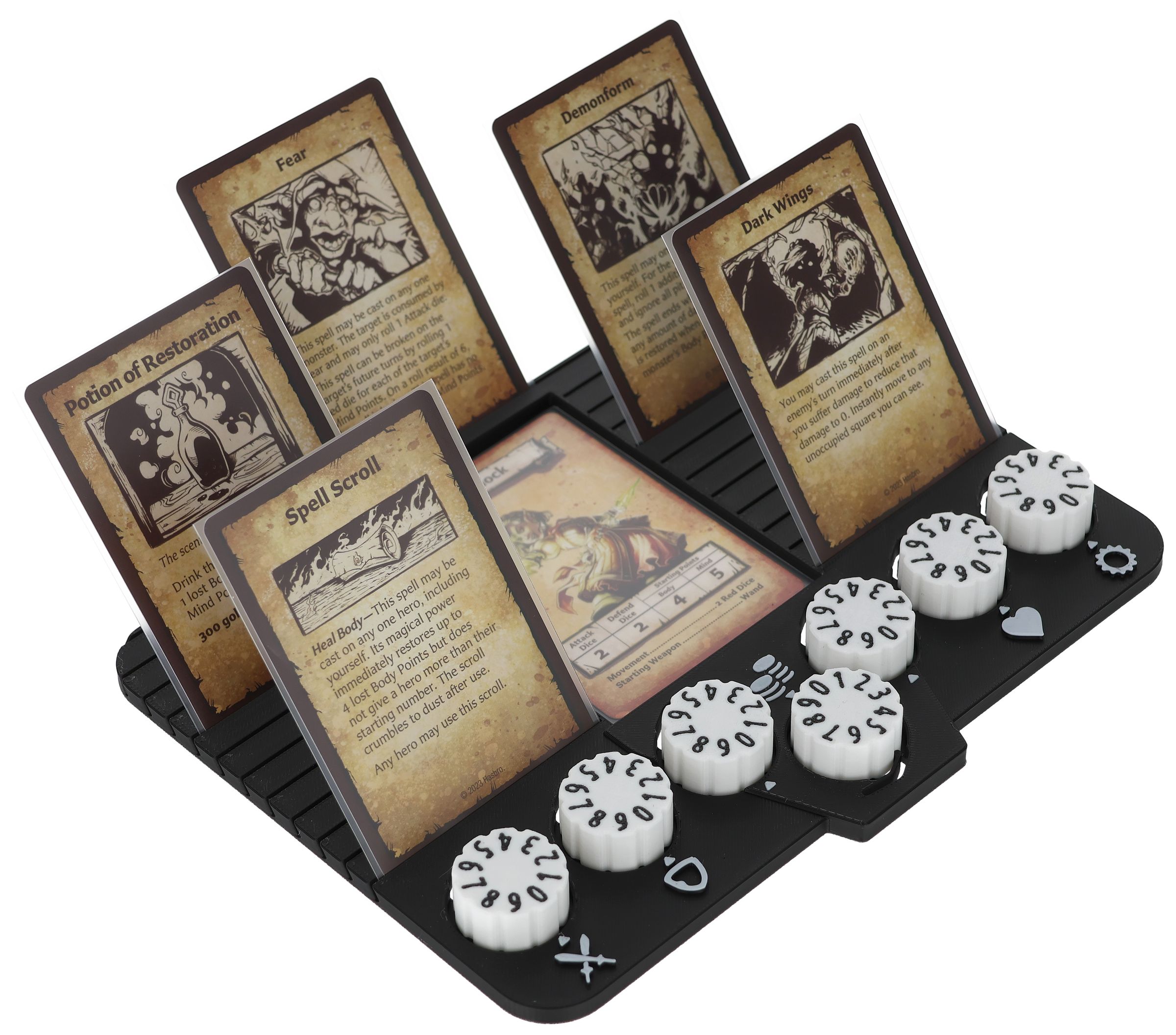 - 22 slots and a card compartment on the Dashboard accommodate up to 23 game cards like equipment cards, treasure cards, magic cards, and rule overviews.