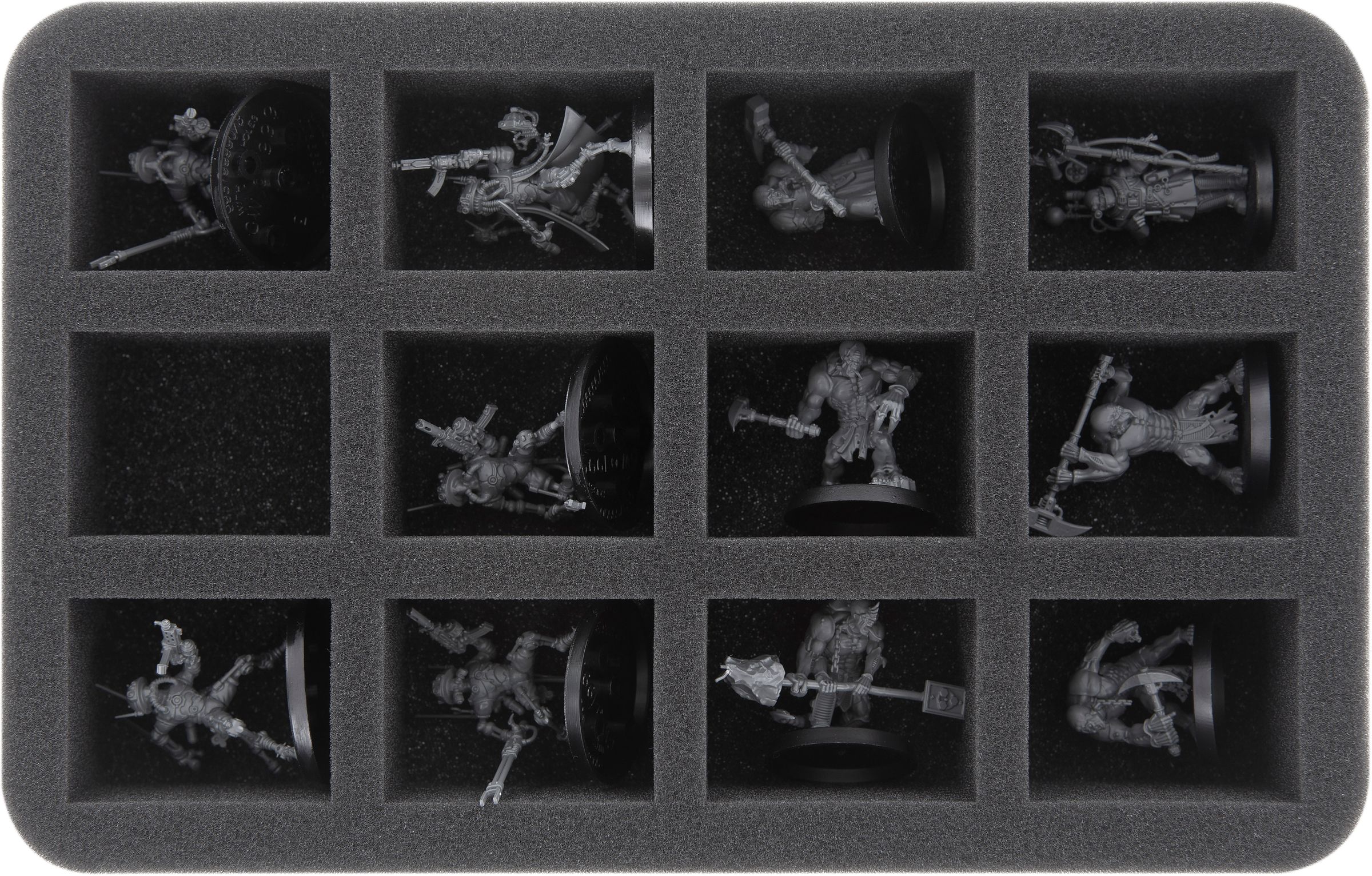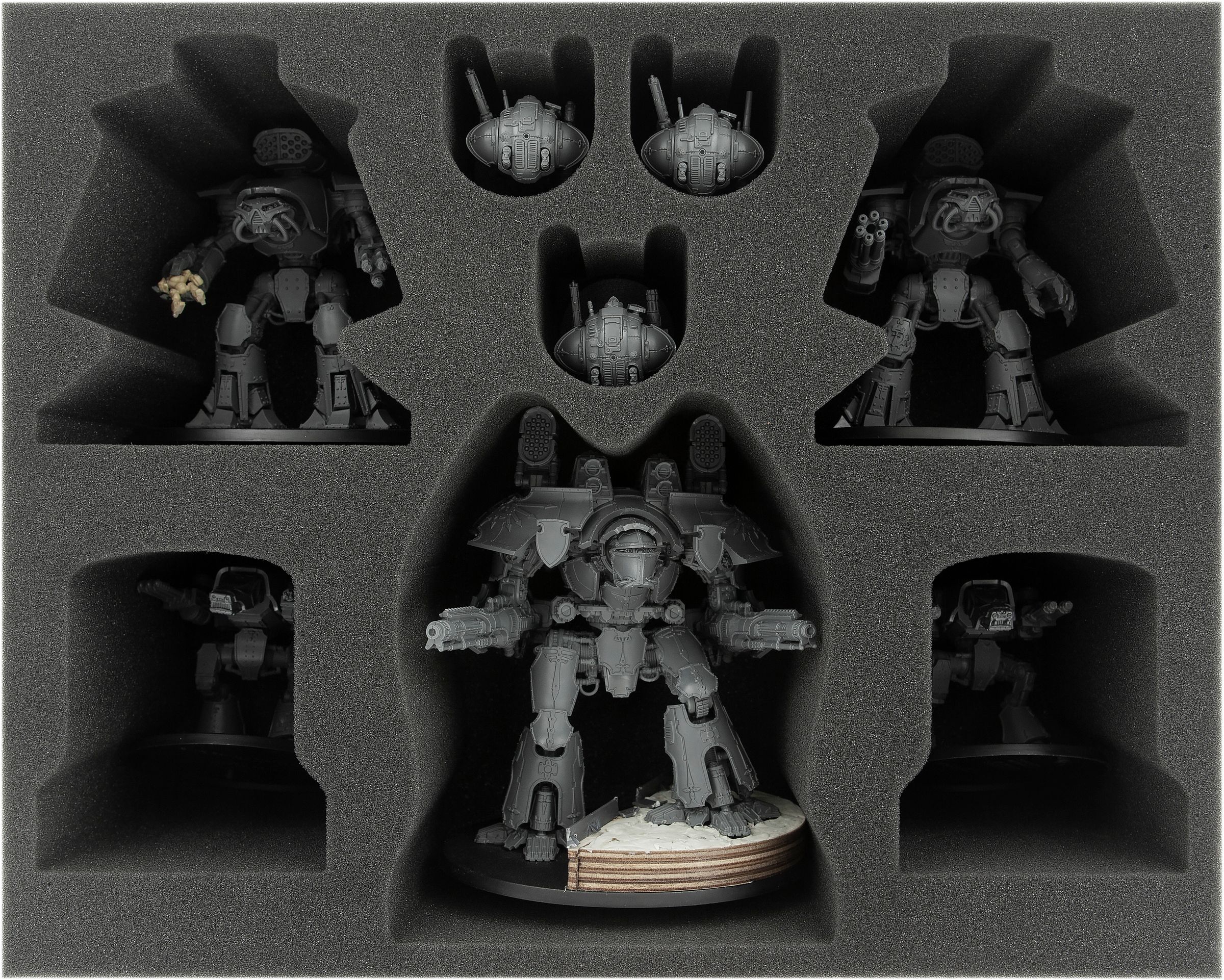 With the exception of 6 small compartments of the FSJQ060BO insert (here you can store small game accessories like dice and tokens), all compartments of the foam trays of the set are suitable for Adeptus Titanicus miniatures.