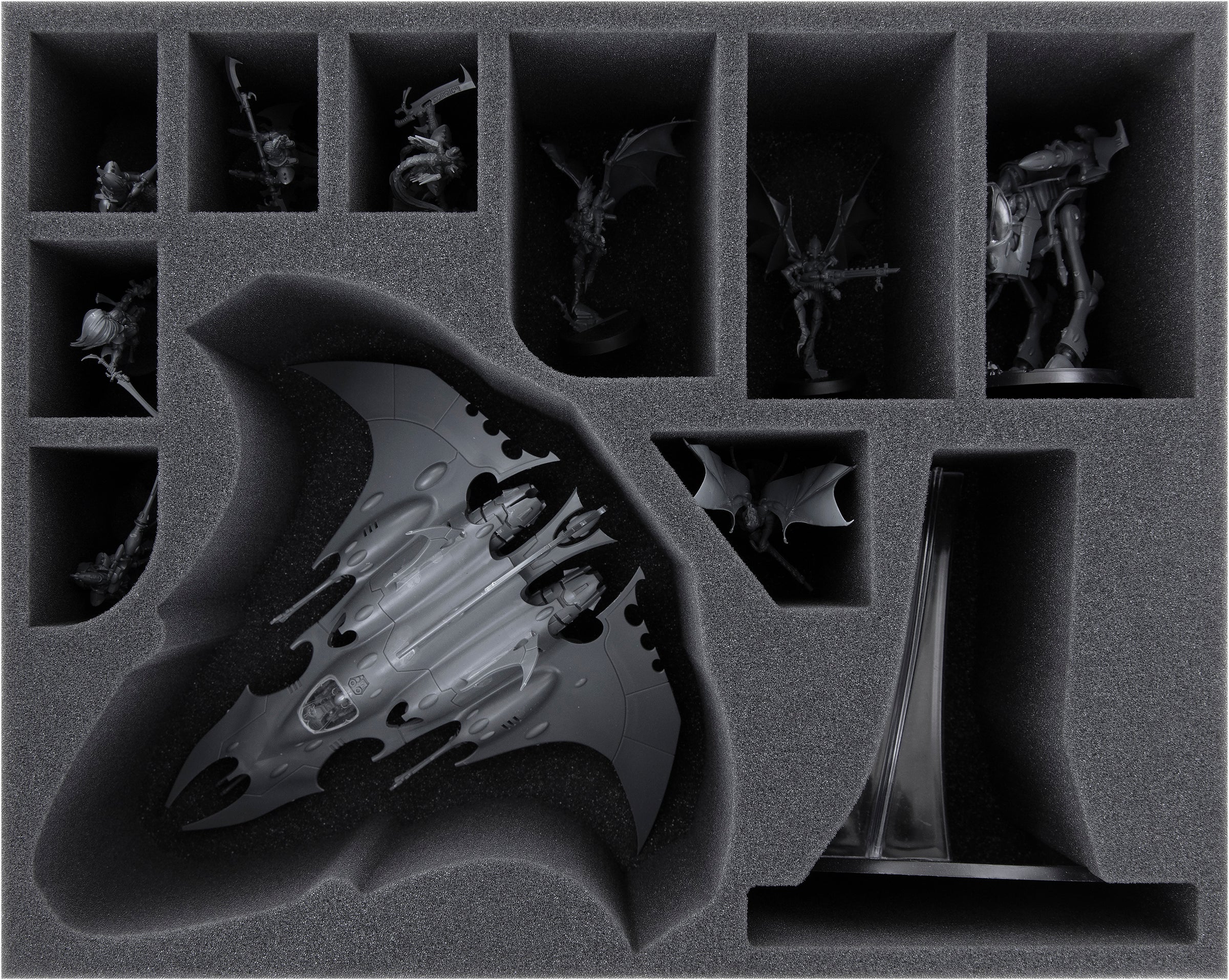 - 1 Full-Size foam tray with 1 miniature-precisely cut compartment for Hemlock Wraithfighter/Crimson Hunter + 1 miniature-precisely cut compartment for the flight stand + 9 compartments for units on jetbikes, with flight stands like Shroud Runners, Windriders, large infantry units like War Walker, winged Autarch, standard infantry like Howling Banshees, Dire Avengers, and models with similar dimensions (FSMEXD105BO)