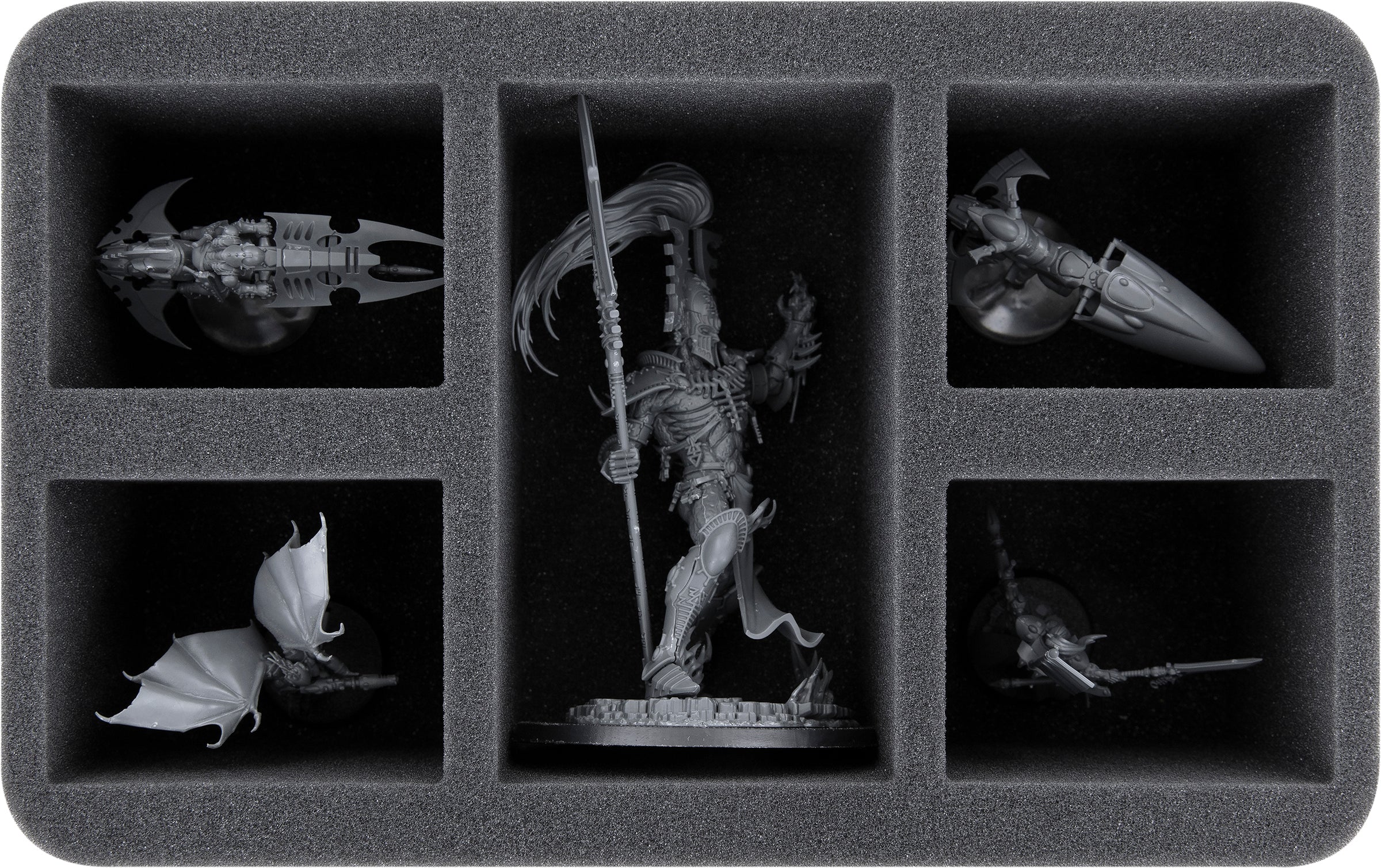 - 1 Half-Size foam tray with 5 compartments for Avatar of Khaine, Windriders, and models with similar dimensions (HS090A007)