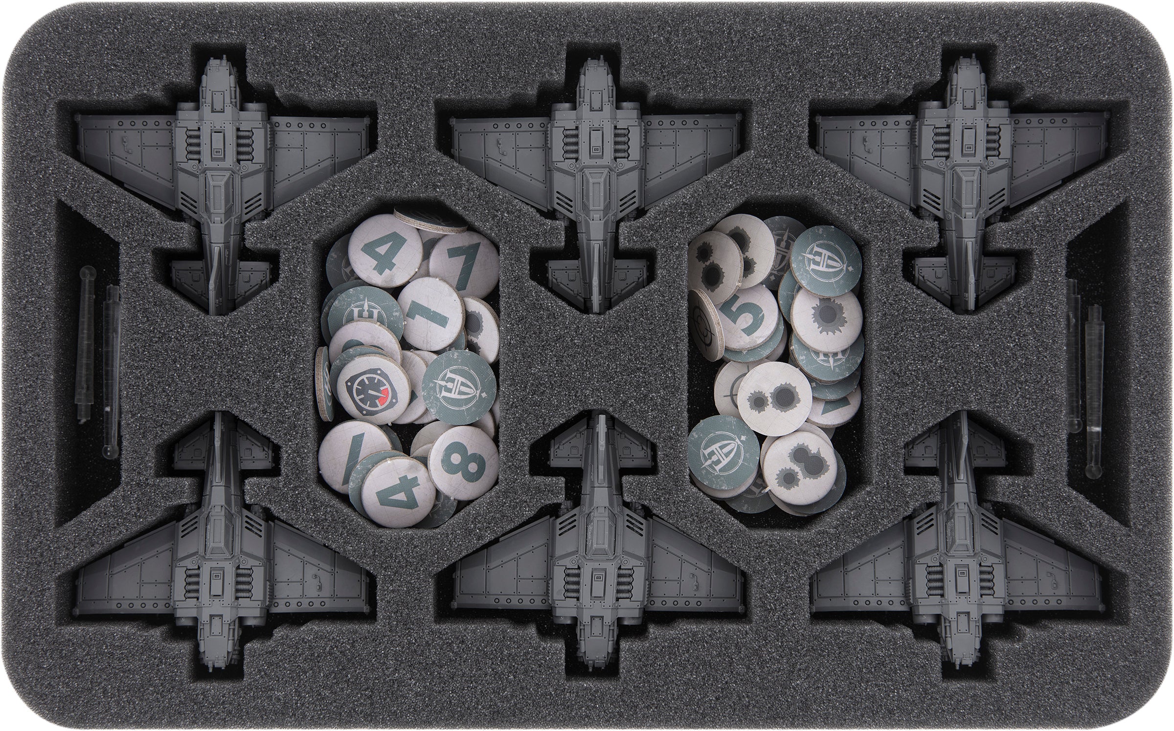 - 1 Half-Size foam tray with ten compartments for Thunderbolt Fighters or Fury Fighters + flying stems + game material (HSMERJ030BO)
