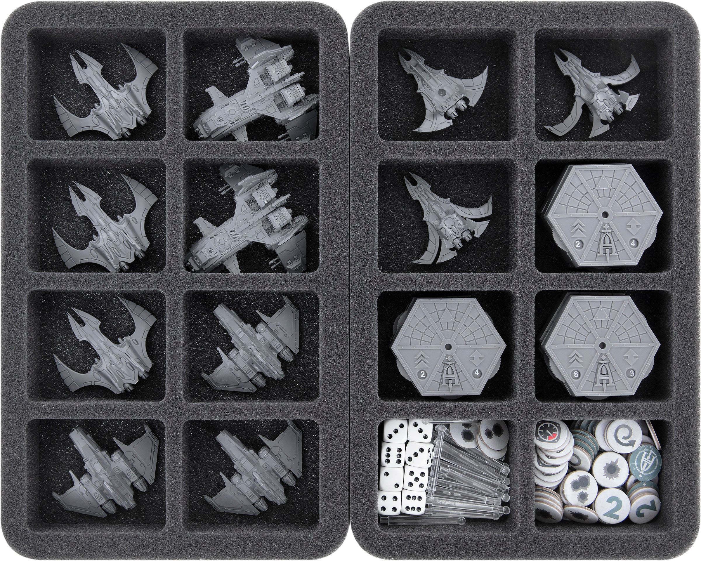 - 2 Half-Size foam trays with 8 compartments each for Adeptus Astartes Xiphon Interceptors, Adeptus Astartes Storm Eagles, Asuryani Nightwings, Asuryani Phoenix Bombers, Bases, Flying Rods, Tokens, and Dice (HS035BF02BO)