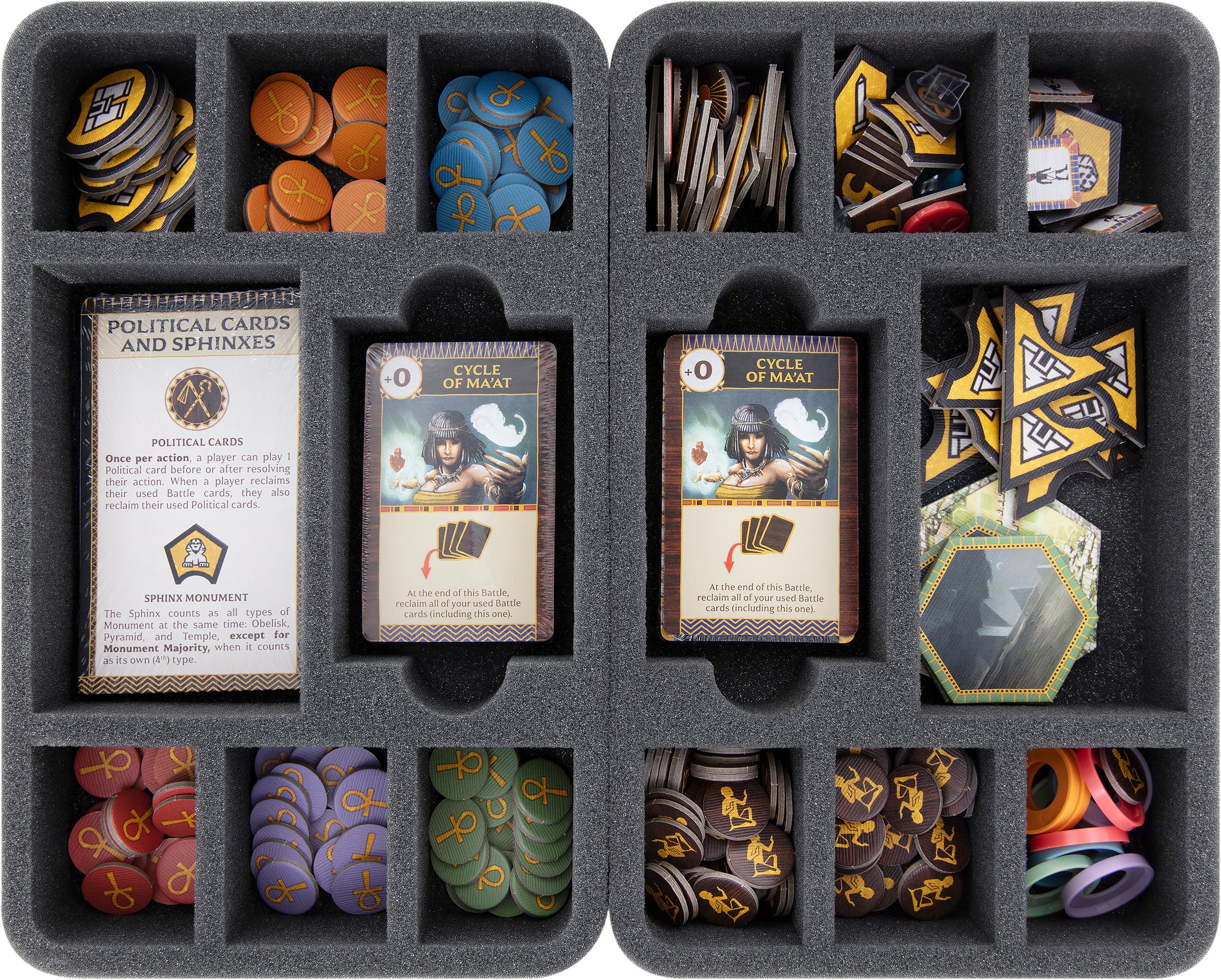 - 2 Full-Size foam trays with 32 compartments each for small miniatures like Warriors, Priests, Cat Mummies, Mummies, Satet + Kickstarter exclusive 3D Sphinxes (FSMEDS040BO)