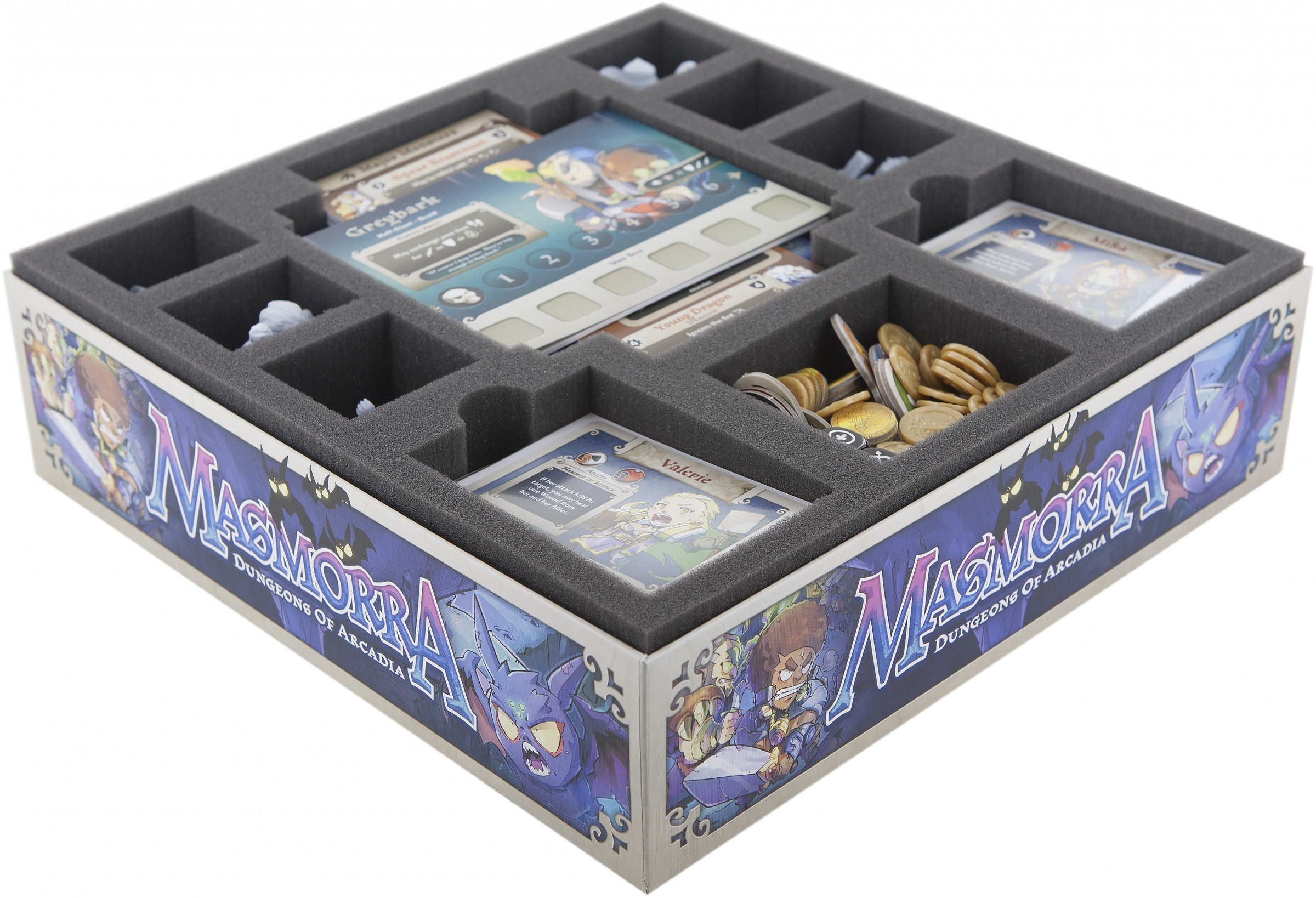 Foam tray with 10 compartments especially for Masmorra: Dungeons of Arcadia board game box. The 10 different compartments are perfect for Masmorra heroes and cards in sleeves.