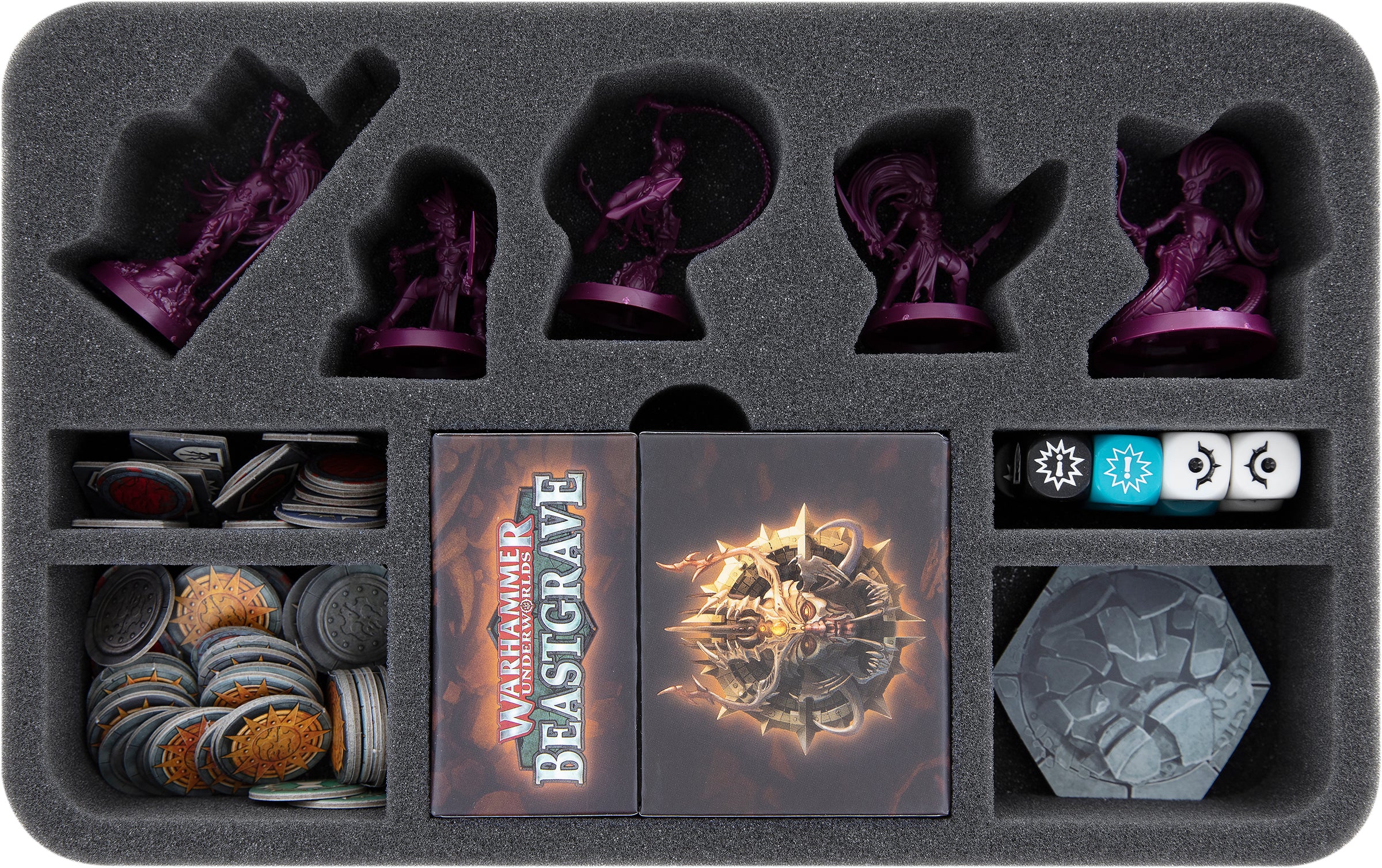 A total of 10 compartments protect the miniatures and help you to sort the game material. Miniature-exactly cut-out compartments provide a safe home for Morgwaeth, Kyrae, Khamyss, Kryssa and Lethyr.