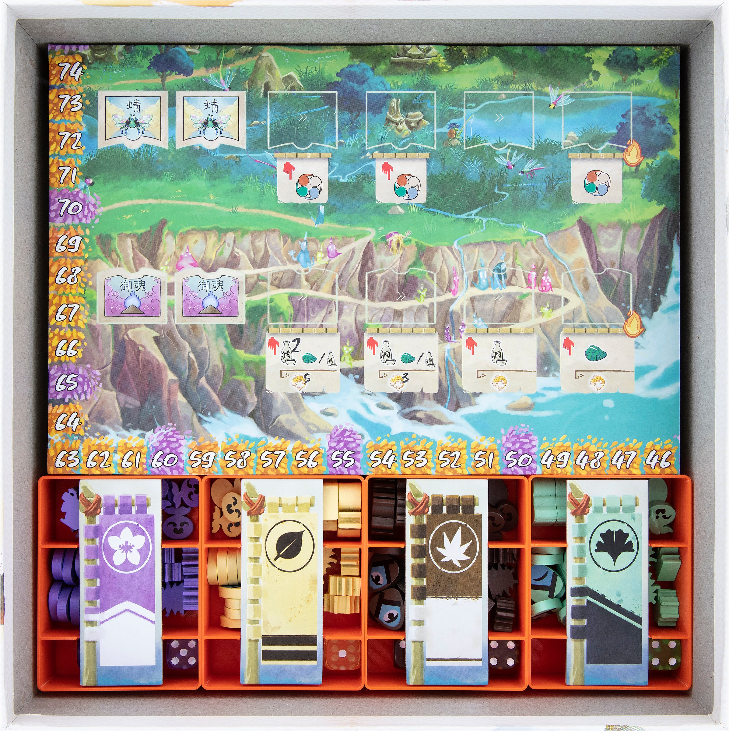 - The inserts ensure order in the box and on the tabletop. Place the card holders with the Bitoku, Yokai, and vision cards and the tile holders with the Building, Crystal, Mitama Spirit, and Dragonfly tiles directly on the Game board.