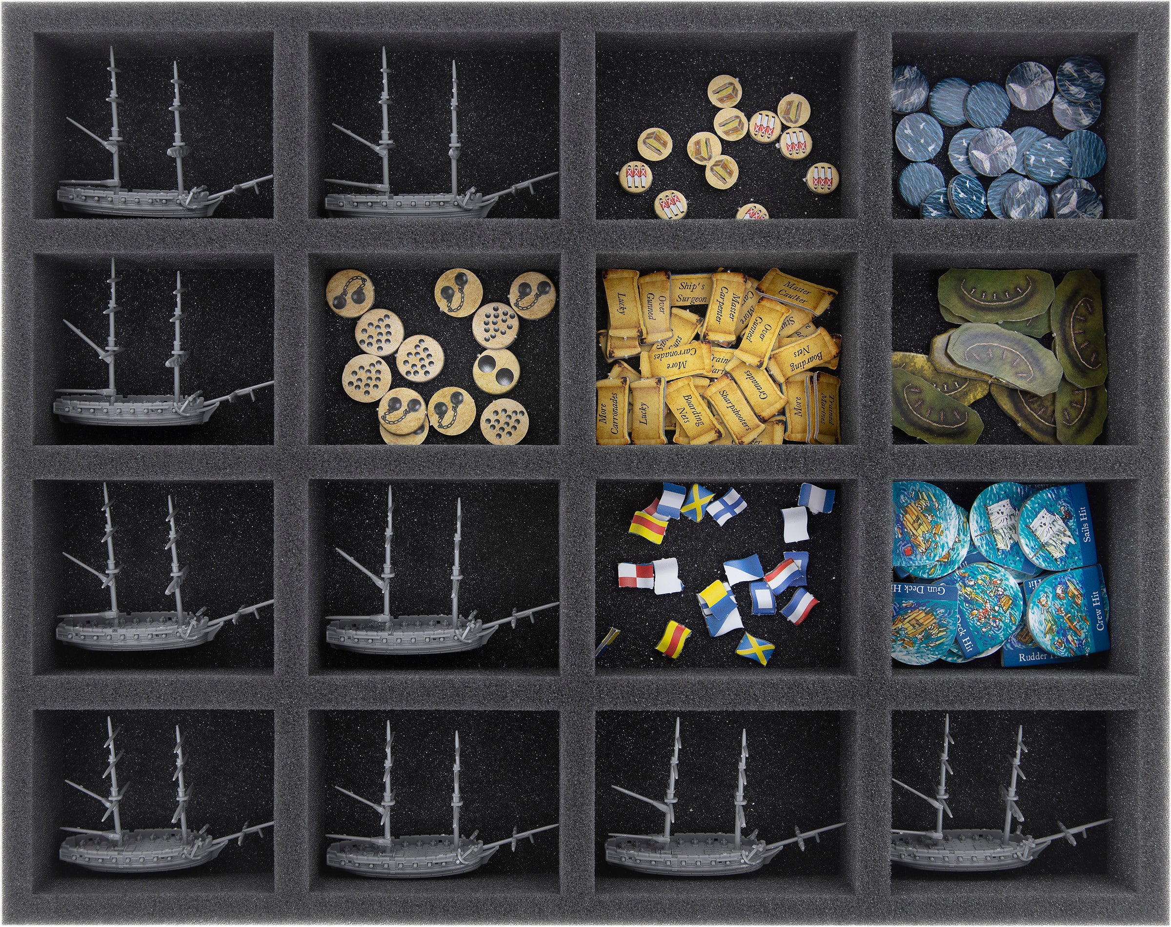 On the flat insert with 16 compartments the small boats (Tiny and Small), like the brigs, are well kept. Here is also space for game material.