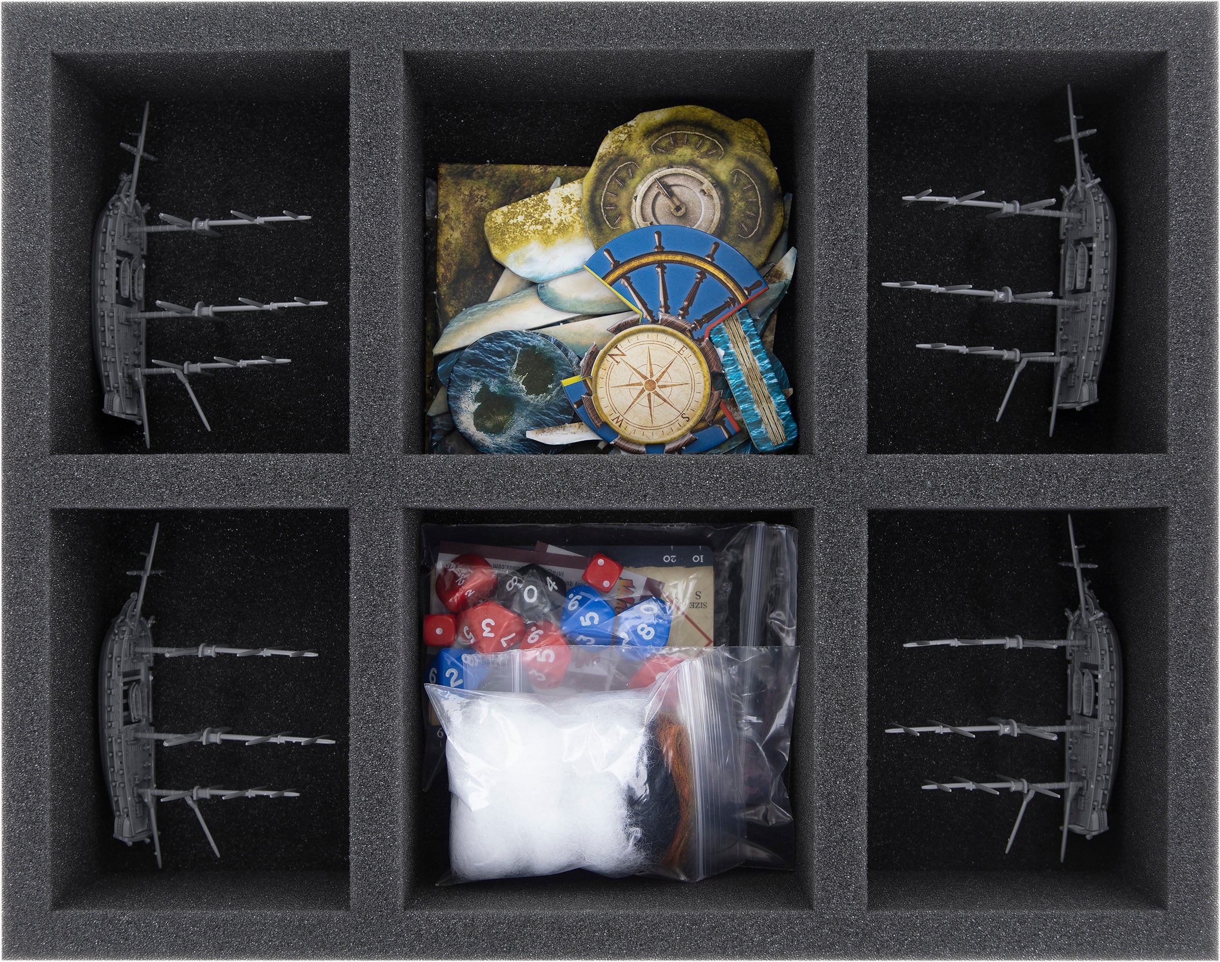 The two inserts with the 6 compartments are ideal to protect all large ships (Medium to Extra Large), such as frigates. Also the larger game components, such as tokens, tiles and cards can be stored here.