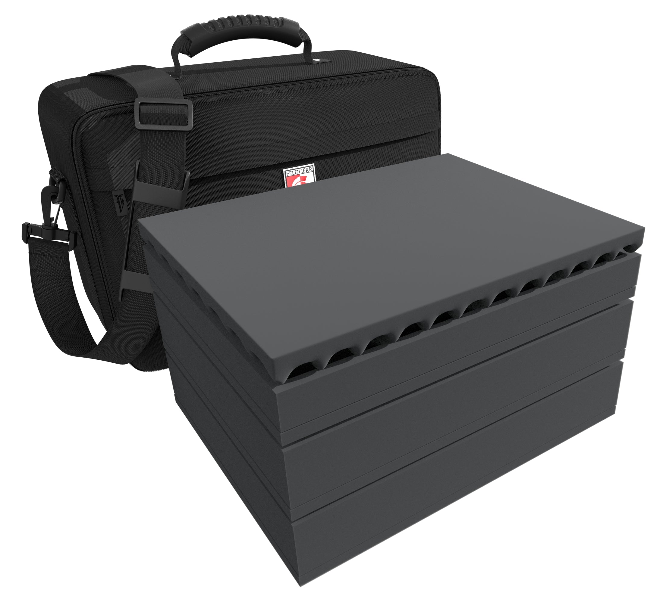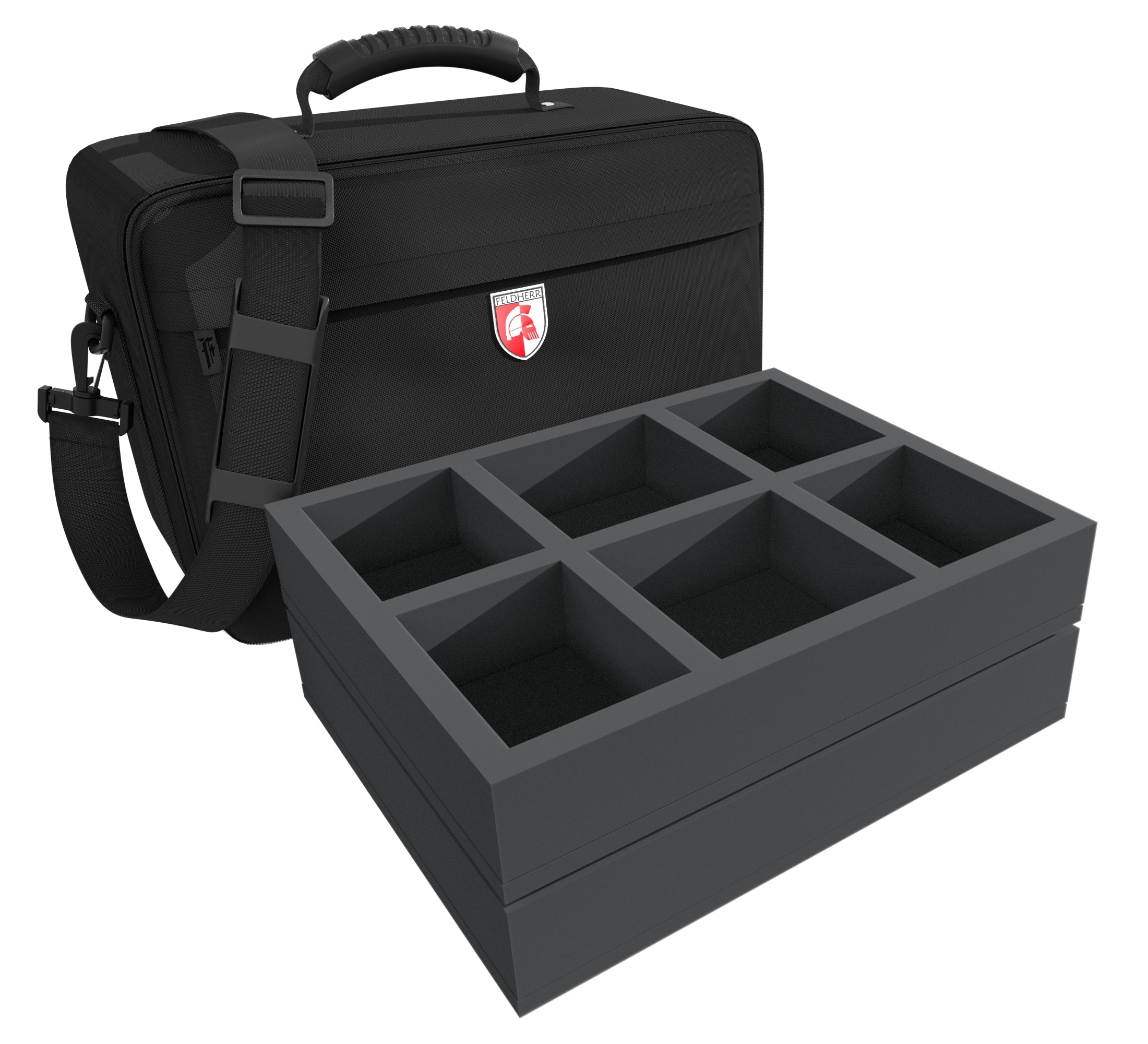 Finally, a topper made of convoluted foam ensures that your squadrons are safely packed all around and that everything is perfectly equipped for transport. More accessories, such as the rulebook or the folded play mat can be stowed on top or in the compartment at the front of the bag.