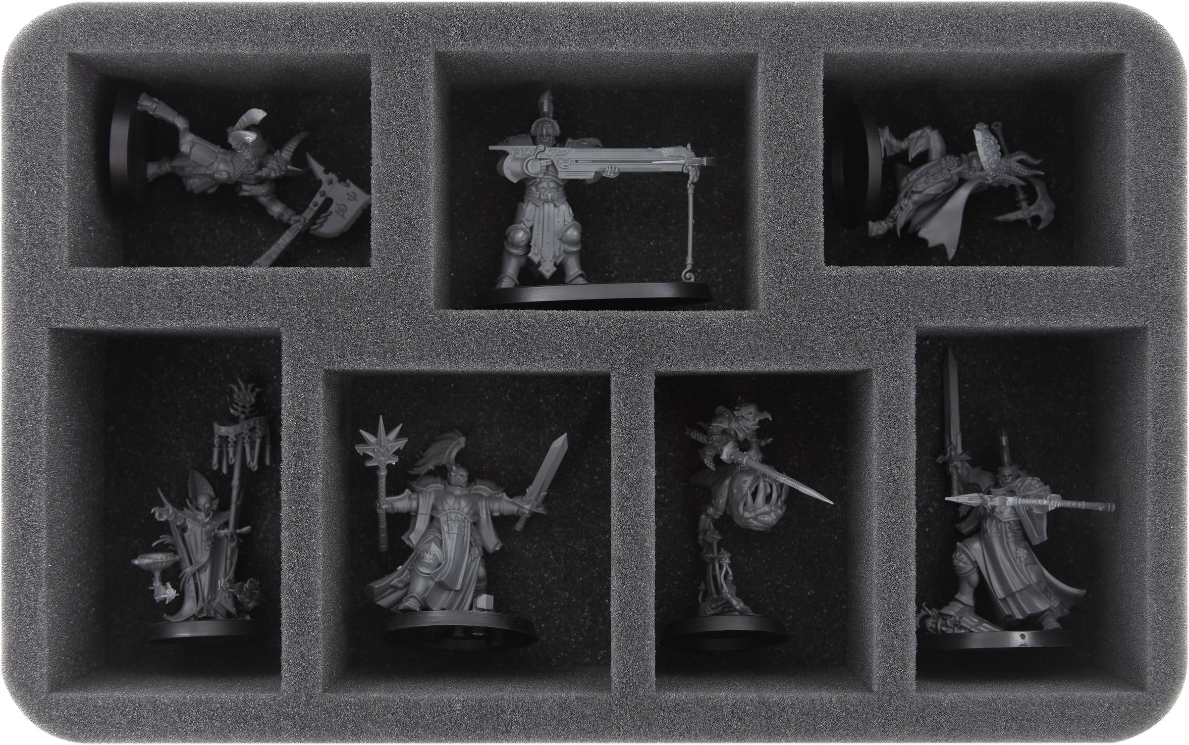 This Half-Size foam tray divides into 7 compartments of different sizes. It is very well suited for neat and safe storage of wider and expansive miniatures of the Beasts of Chaos, on bases up to 50 mm.