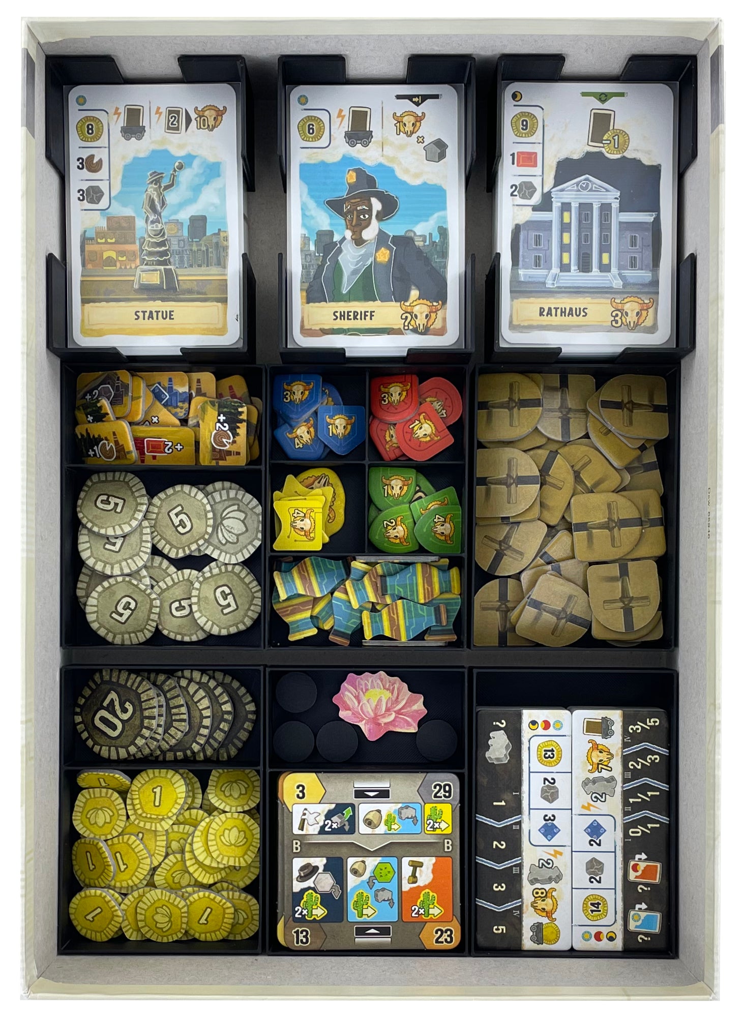 - 3 token holders, each with 2 compartments for small game material like region markers, starting player token, solo tiles, coins, production sites