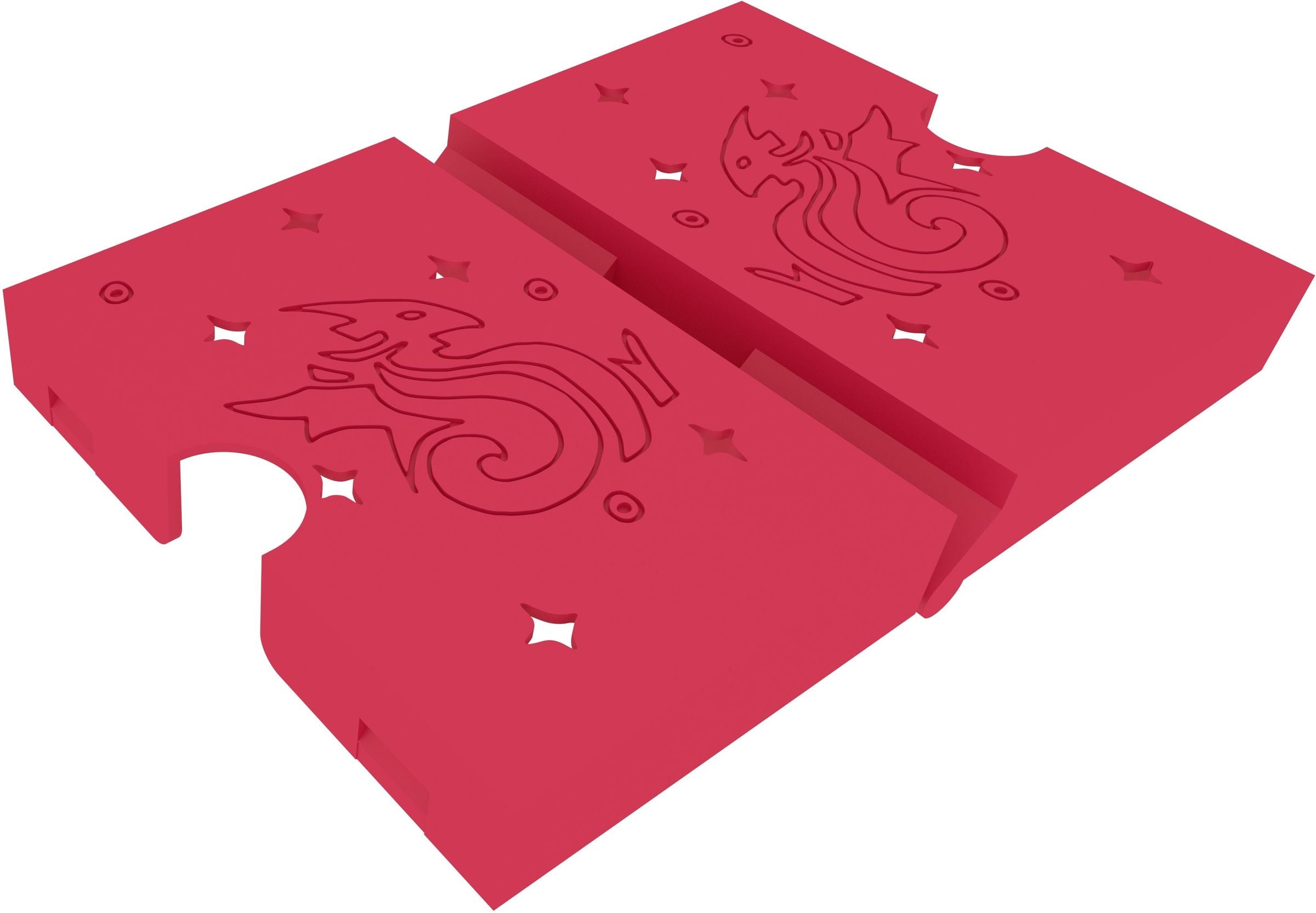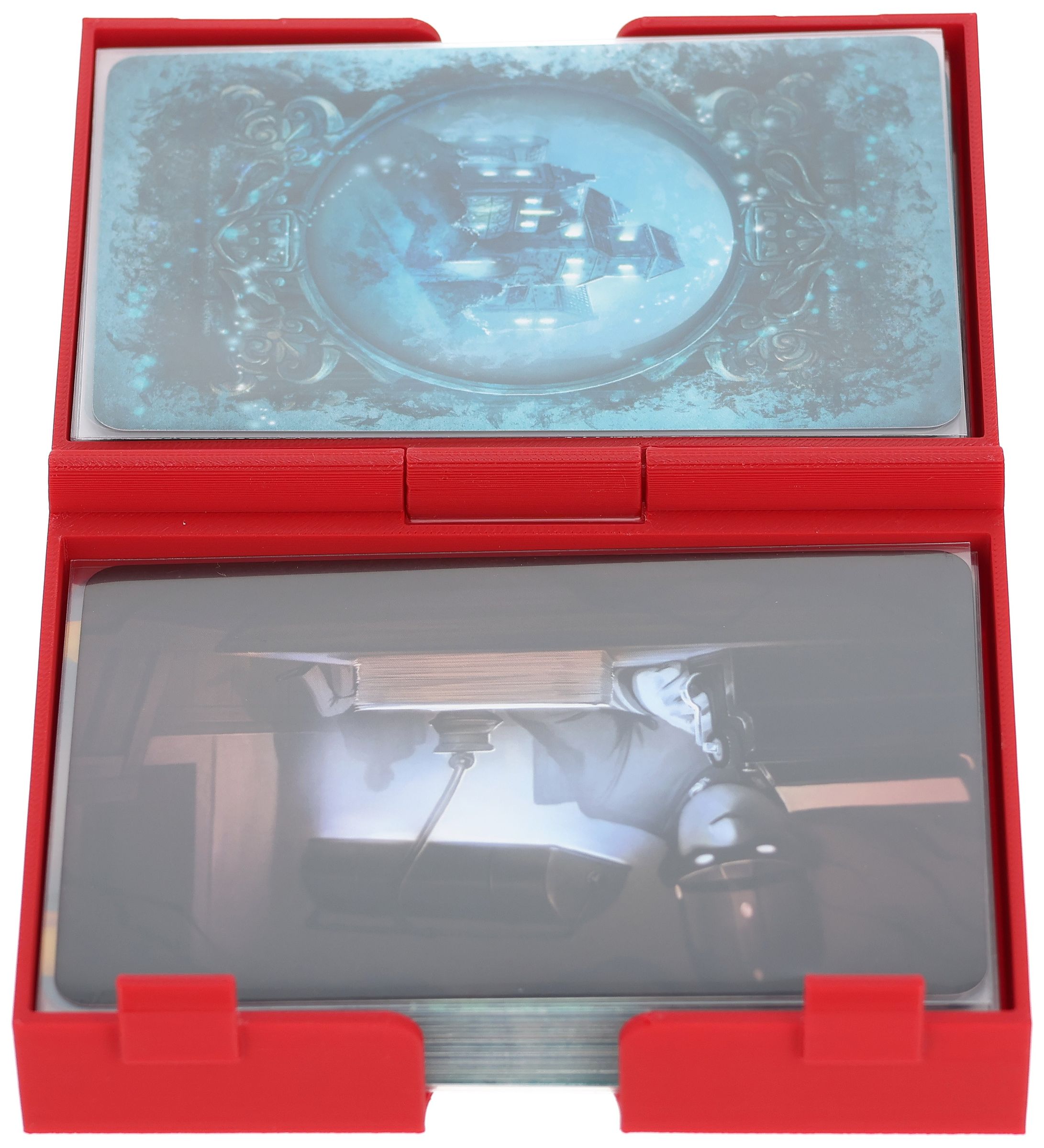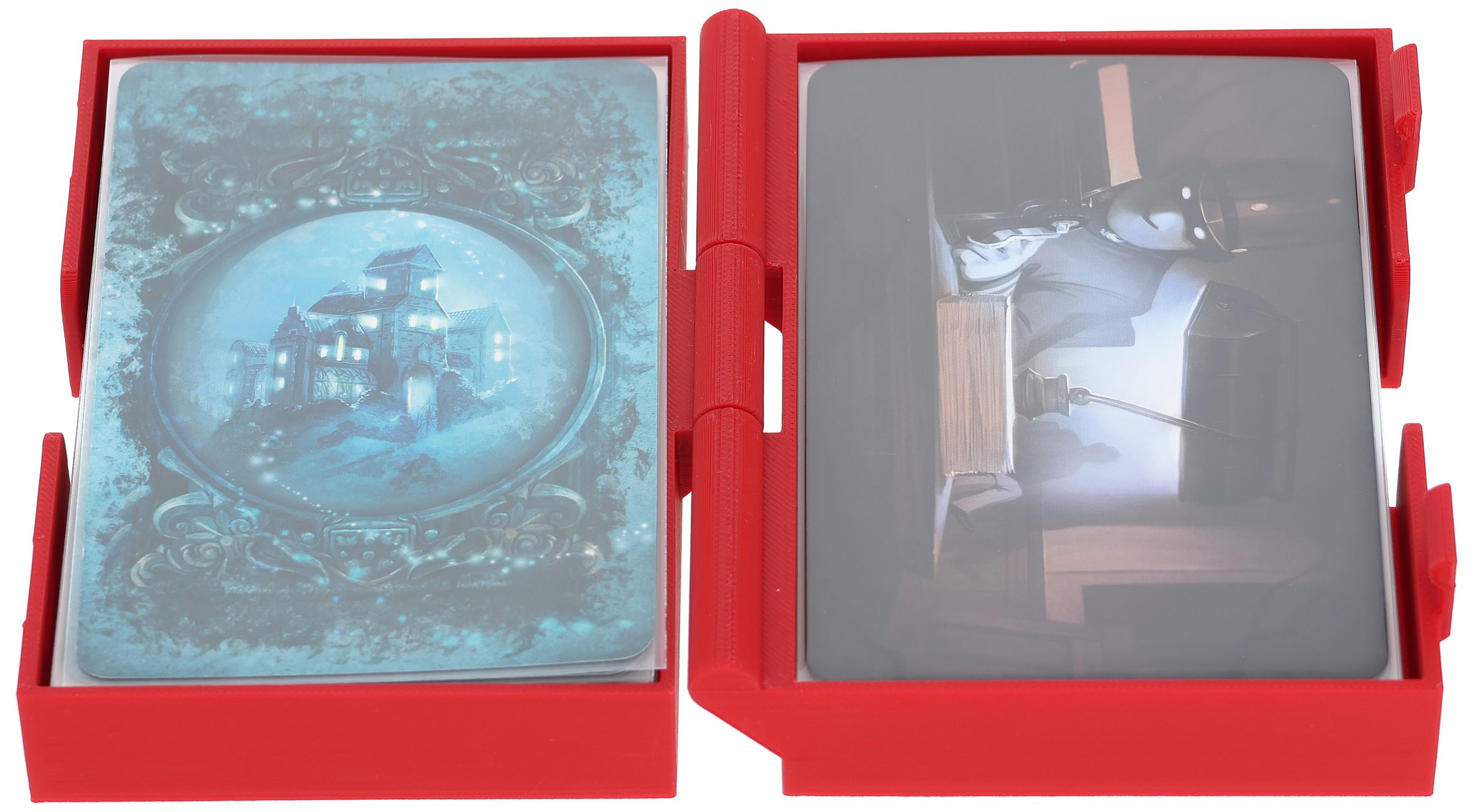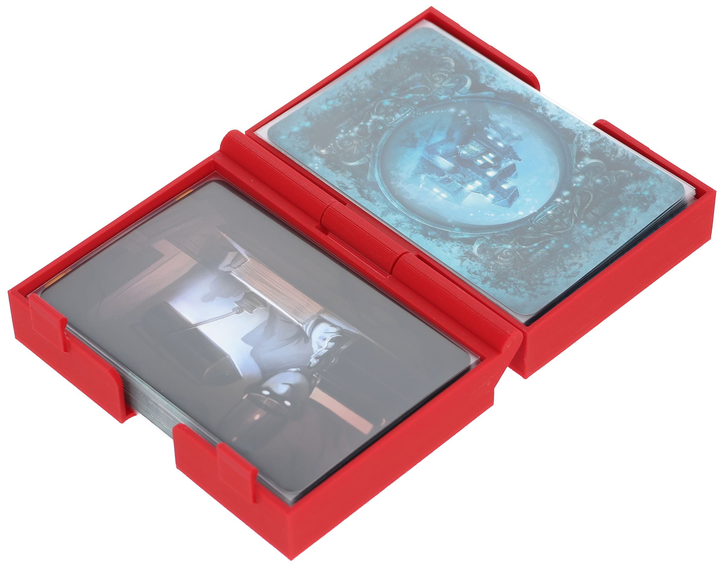 With this hinged and lockable Feldherr card deck holder, your cards are stored safely and crease-free. Whether in your bag or on the gaming table, this card holder keeps things tidy. When folded out on the gaming table, it serves as a functional, two-part tray for draw and discard piles.