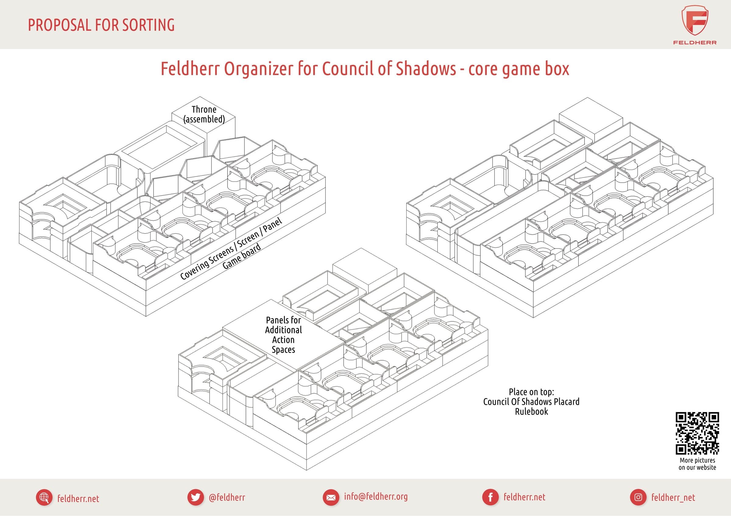 - Store large-format game components separately in the box. Keep the Covering screens, Game board parts, the Panel, and the Screen underneath the Organizer trays. The Rulebook, Council of Shadows placard and the two Panels for additional action spaces are kept on the inserts.