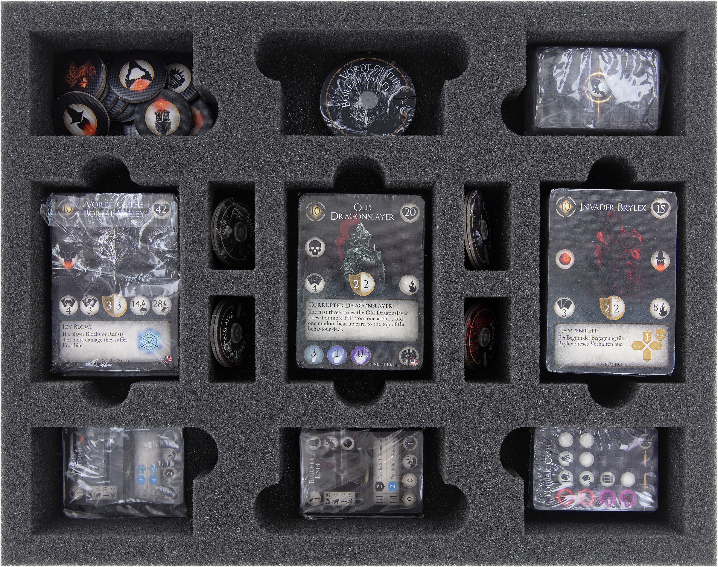 All foam inserts fit stacked in the Storage Box FSLB310. The supplied foam topper is placed covers the foam inserts. On top of this there is space for the character boards of the "Characters Expansion", the folding board of the "Vordt of the Boreal Valley Expansion" and the Iron Keep Tiles of the "Iron Keep Expansion".