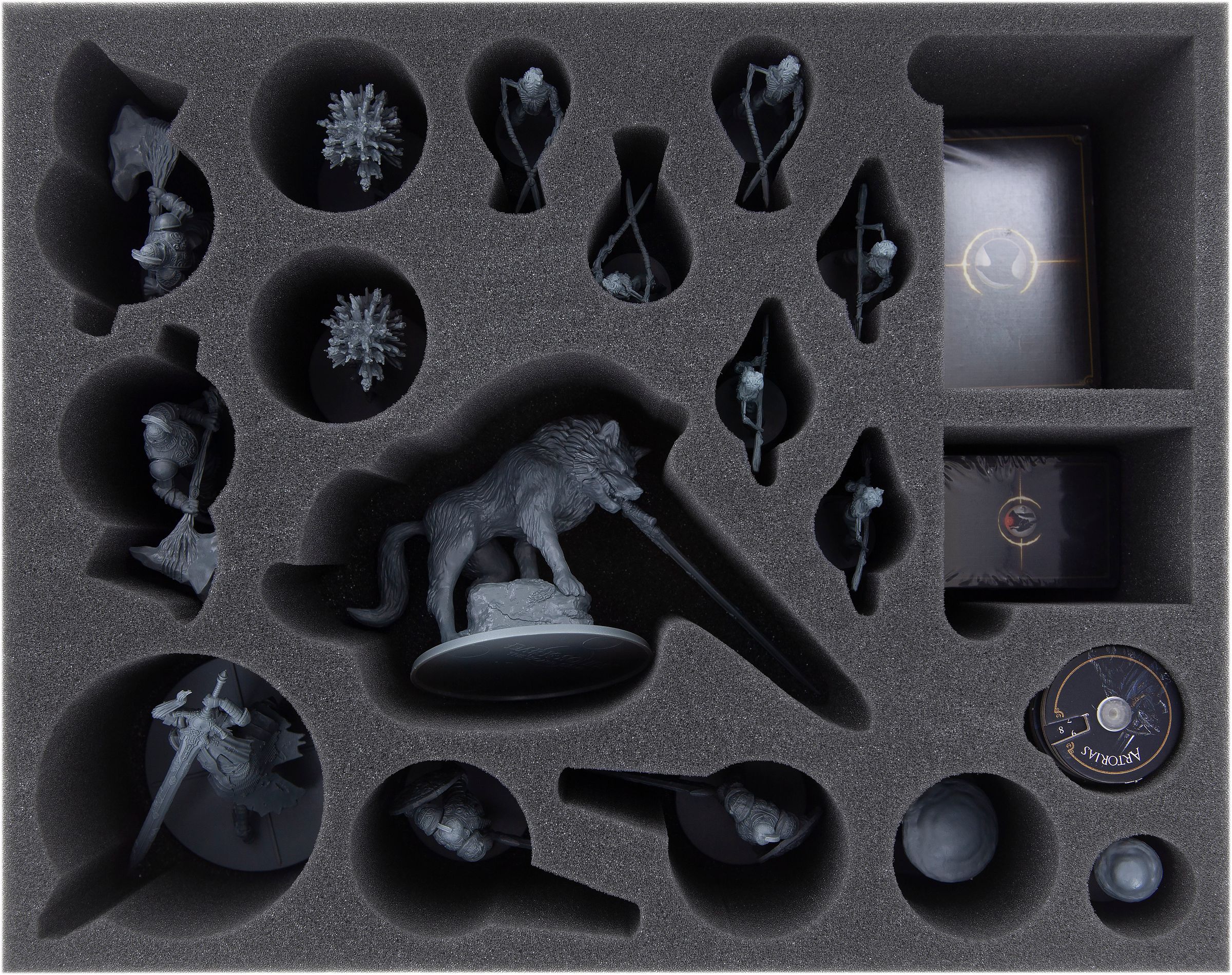 In the center of the insert there is a large compartment that is exactly tailored to the miniature of the Great Grey Wolf Sif. His master Artorias stands in the round compartment next to it.