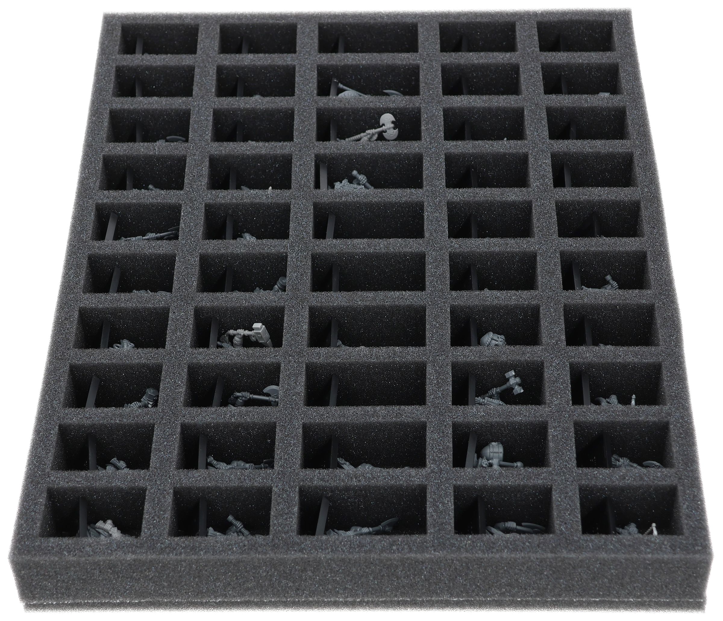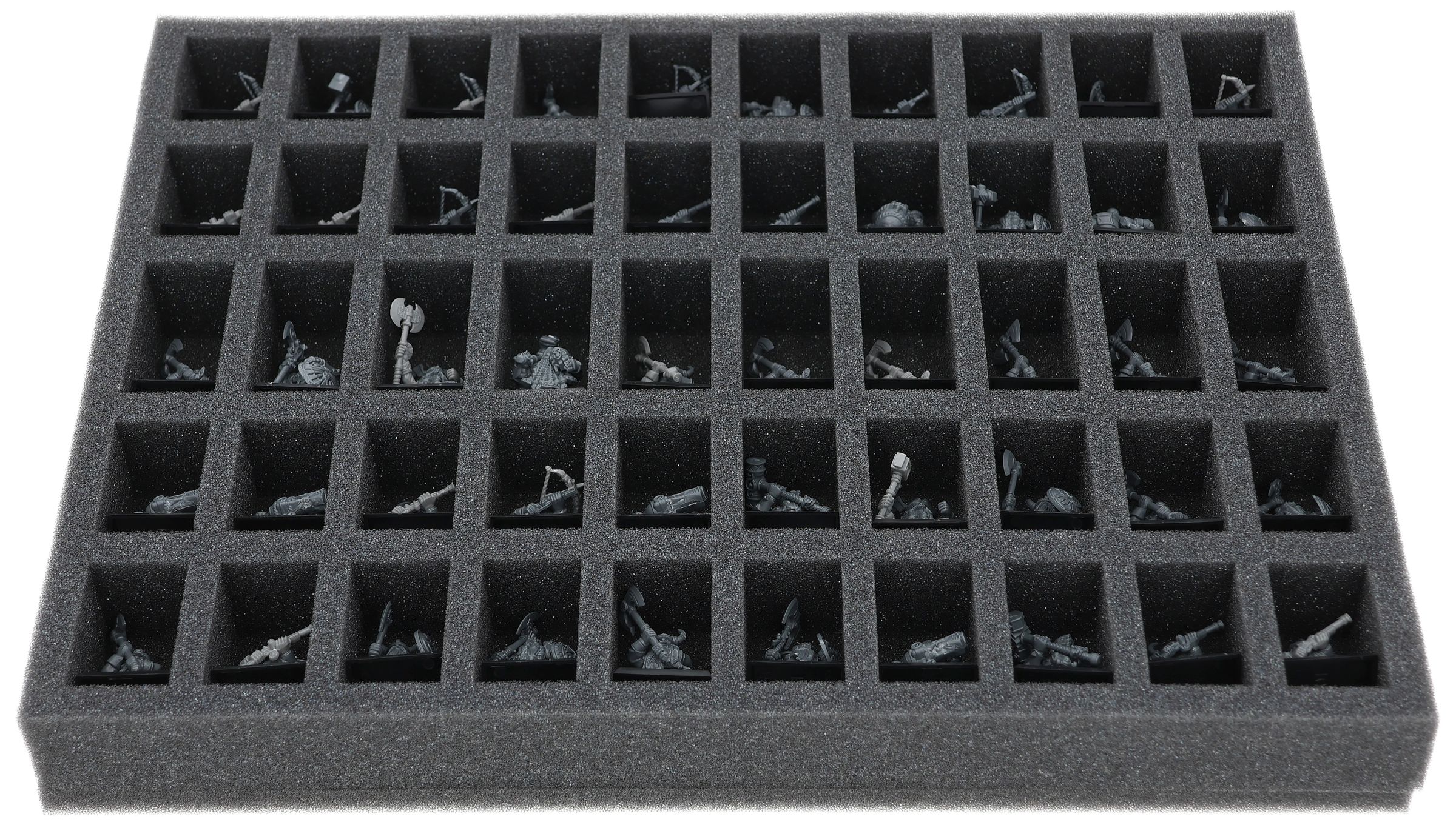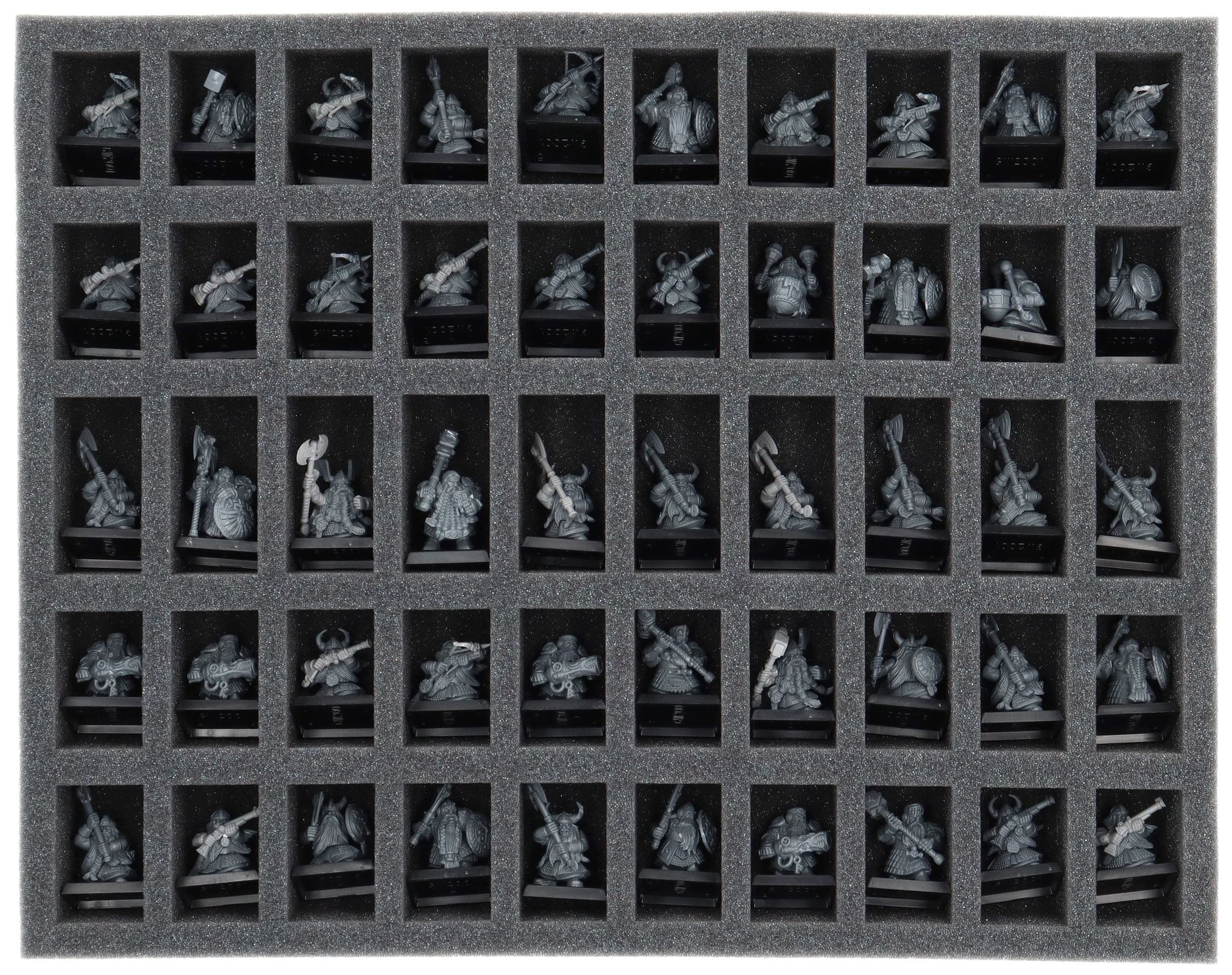 On this Feldherr foam tray you have space for up to 50 miniatures of your army. The insert is especially suitable for storing the Dwarf Warriors, Dwarf Quarrelers, Dwarf Ironbreakers, Dwarf Hammerers, Dwarf Slayers, Dwarf Miners and similar sized models.