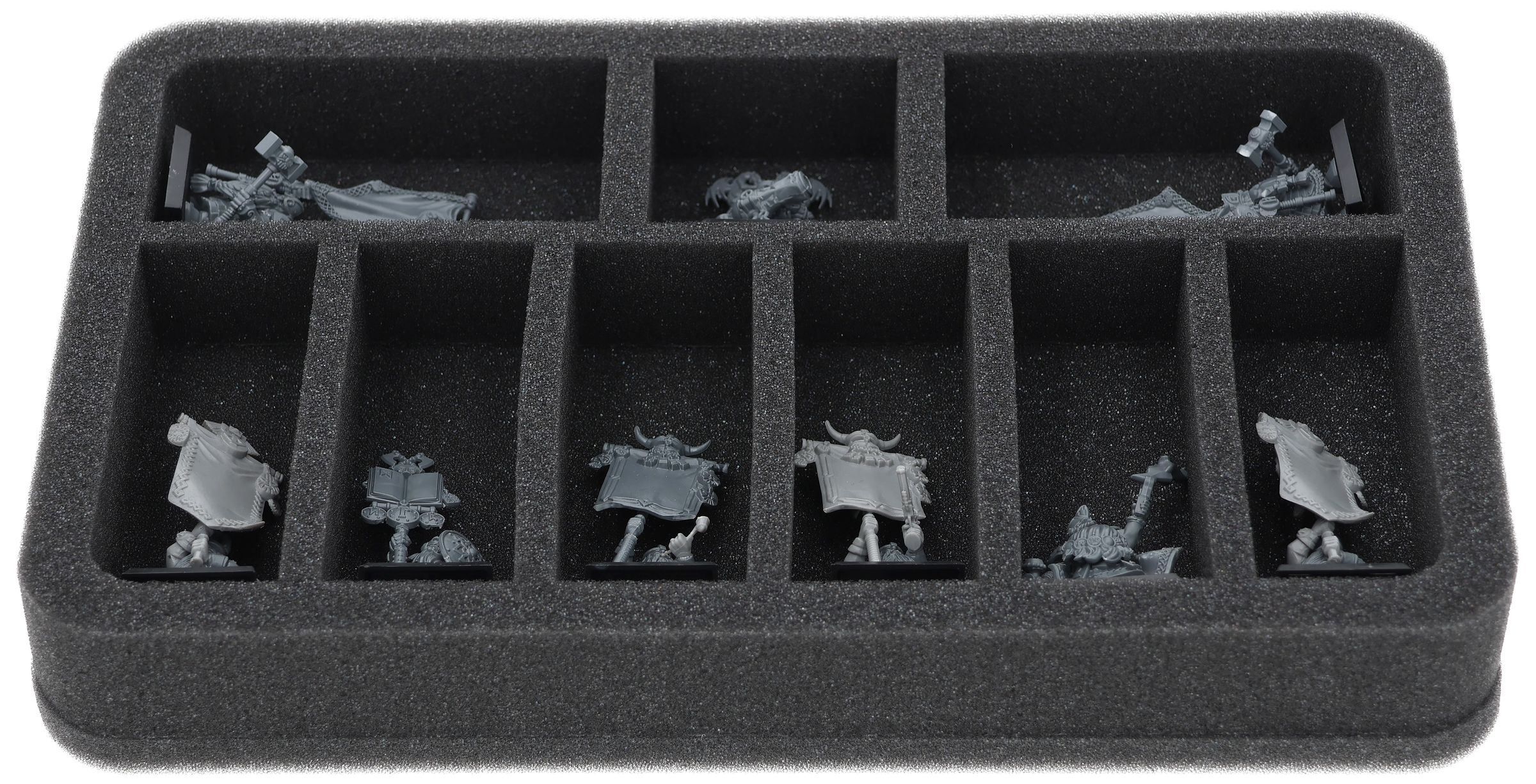 On this Feldherr foam tray you have space for up to 9 miniatures of your army. The insert is especially suitable for storing the Dwarf Warriors, Dwarf Quarrelers, Dwarf Ironbreakers, Dwarf Hammerers, Dwarf Slayers and similar sized models.