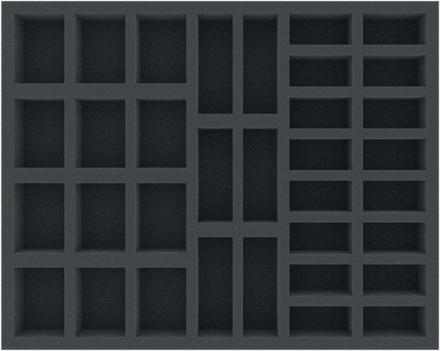 The Full-Size foam tray has the dimensions: 345 mm x 275 mm x 40 mm total height (30 mm usable height + 10 mm foam base).