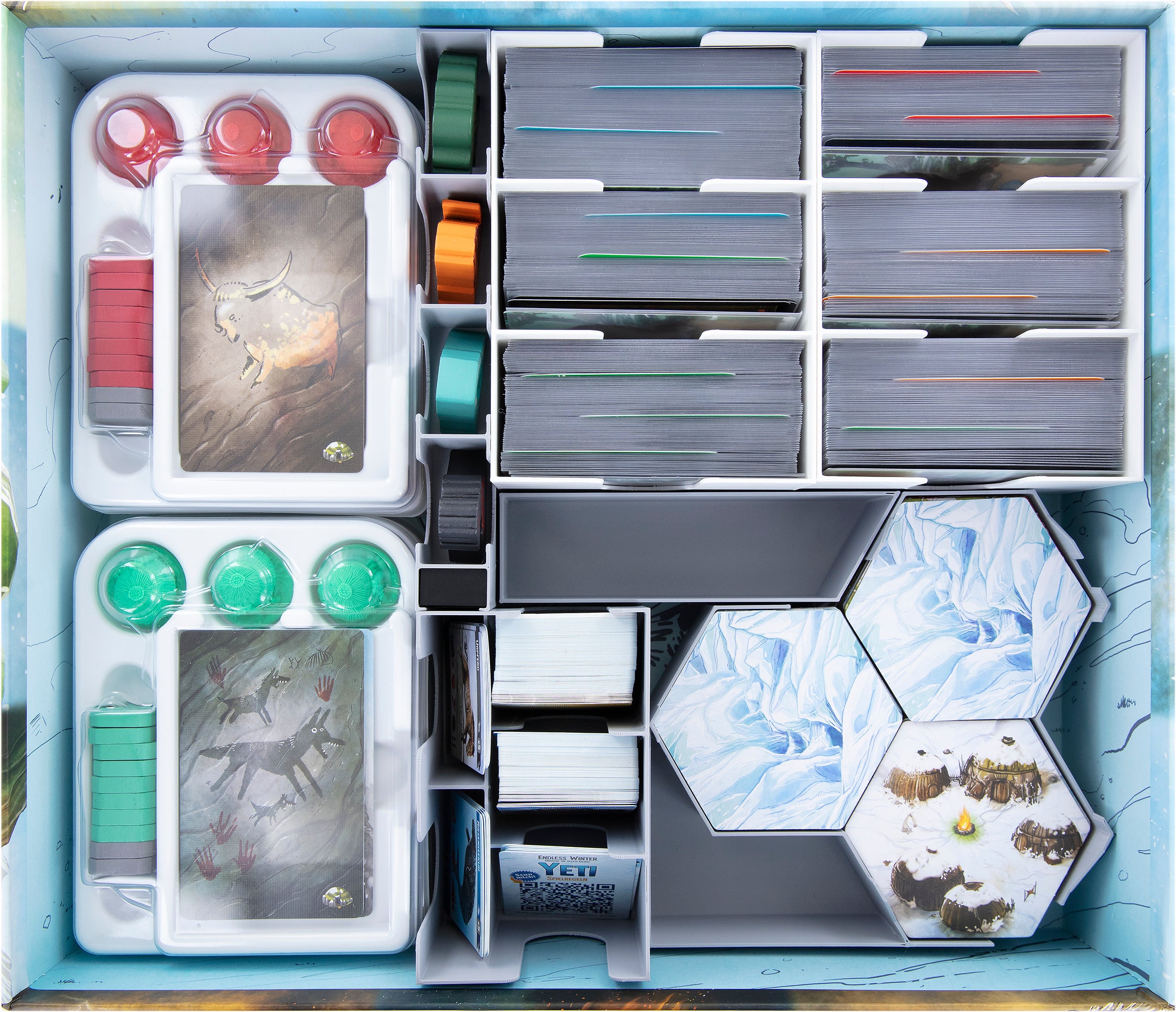 • 1 plastic figure tray with twelve compartments for Chief Figures and game material like Fish Tokens, Rest Tokens, Glacier Tokens, Cave Painting Boards-Supports, Sacred Stones, and Round Marker