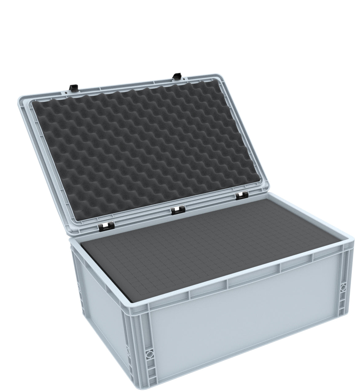 Set of Eurobox 600 mm x 400 mm x 235 mm filled with 2 Pick and Pluck foam inserts. The grid of the foam allows an individual adaptation of the foam inserts to all shapes. It is ideally suited as protection for the transport of various industrial products such as medical equipment, tool components or technical equipment. The pick and pluck foam is perforated with a grid of 20 mm x 20 mm x height of the insert (90 mm) and a circumferential edge of 25 mm. As a bottom we use a 20 mm thick base (DS020B), which makes it possible to transport even heavy products. The nap foam serves as top cover and is cut exactly to fit the lid of Auer's Eurobox. Since it is equipped with a self-adhesive foil, you do not need any further tools. All you have to do is remove the adhesive foil from the foam insert and glue the self-adhesive side into the hinged top of the Eurobox. The entire set can therefore be designed, adapted and used according to your personal needs without special tools.