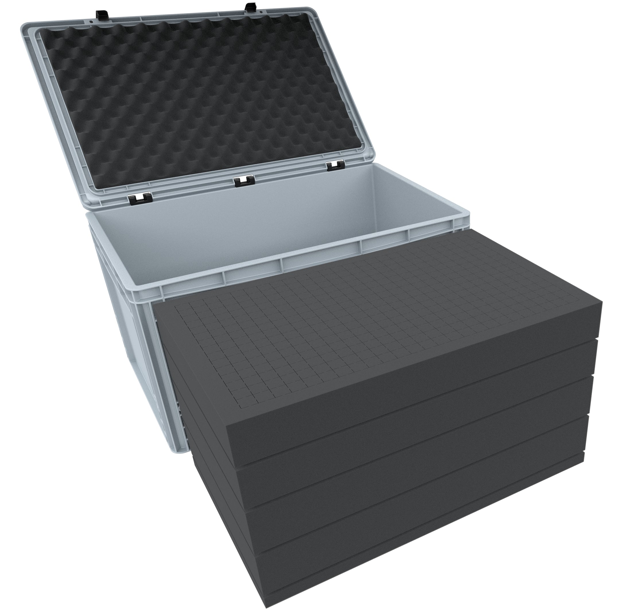Set of Eurobox 600 mm x 400 mm x 335 mm filled with 4 Pick and Pluck foam inserts. The grid of the foam allows an individual adaptation of the foam inserts to all shapes. It is ideally suited as protection for the transport of various industrial products such as medical equipment, tool components or technical equipment. The pick and pluck foam is perforated with a grid of 20 mm x 20 mm x height of the insert (60 mm or 70 mm) and a circumferential edge of 25 mm. As a bottom we use a 20 mm thick base (DS020B), which makes it possible to transport even heavy products. The nap foam serves as top cover and is cut exactly to fit the lid of Auer's Eurobox. Since it is equipped with a self-adhesive foil, you do not need any further tools. All you have to do is remove the adhesive foil from the foam insert and glue the self-adhesive side into the hinged top of the Eurobox. The entire set can therefore be designed, adapted and used according to your personal needs without special tools.