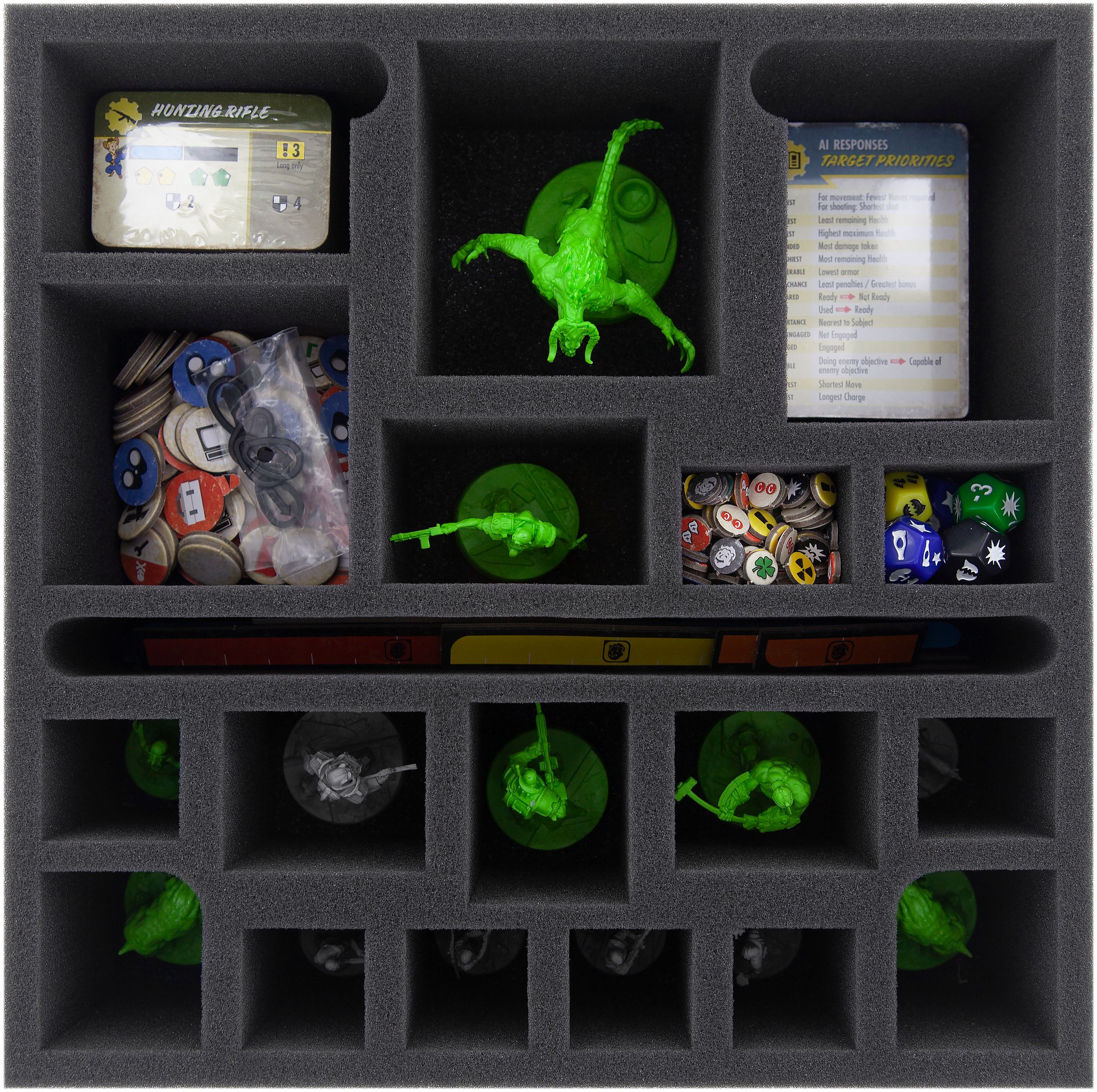One custom cut foam tray, one matching foam topper: This is all you need to store the entire game material of Fallout: Wasteland Warfare in the original board game box.