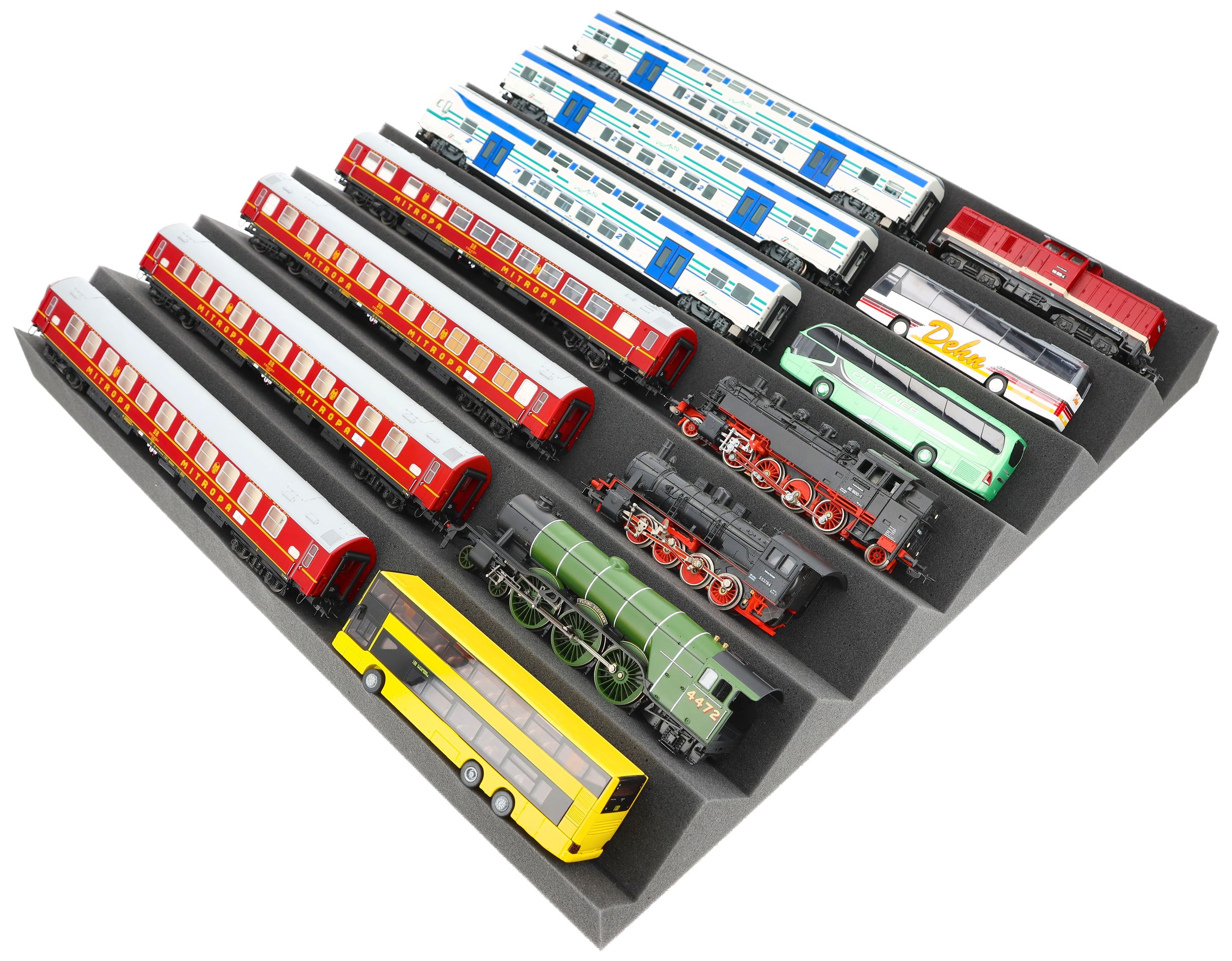 Customizable zig-zag foam mat for safe and tidy storage of model railways in H0 gauge and 00 gauge - always the right size.