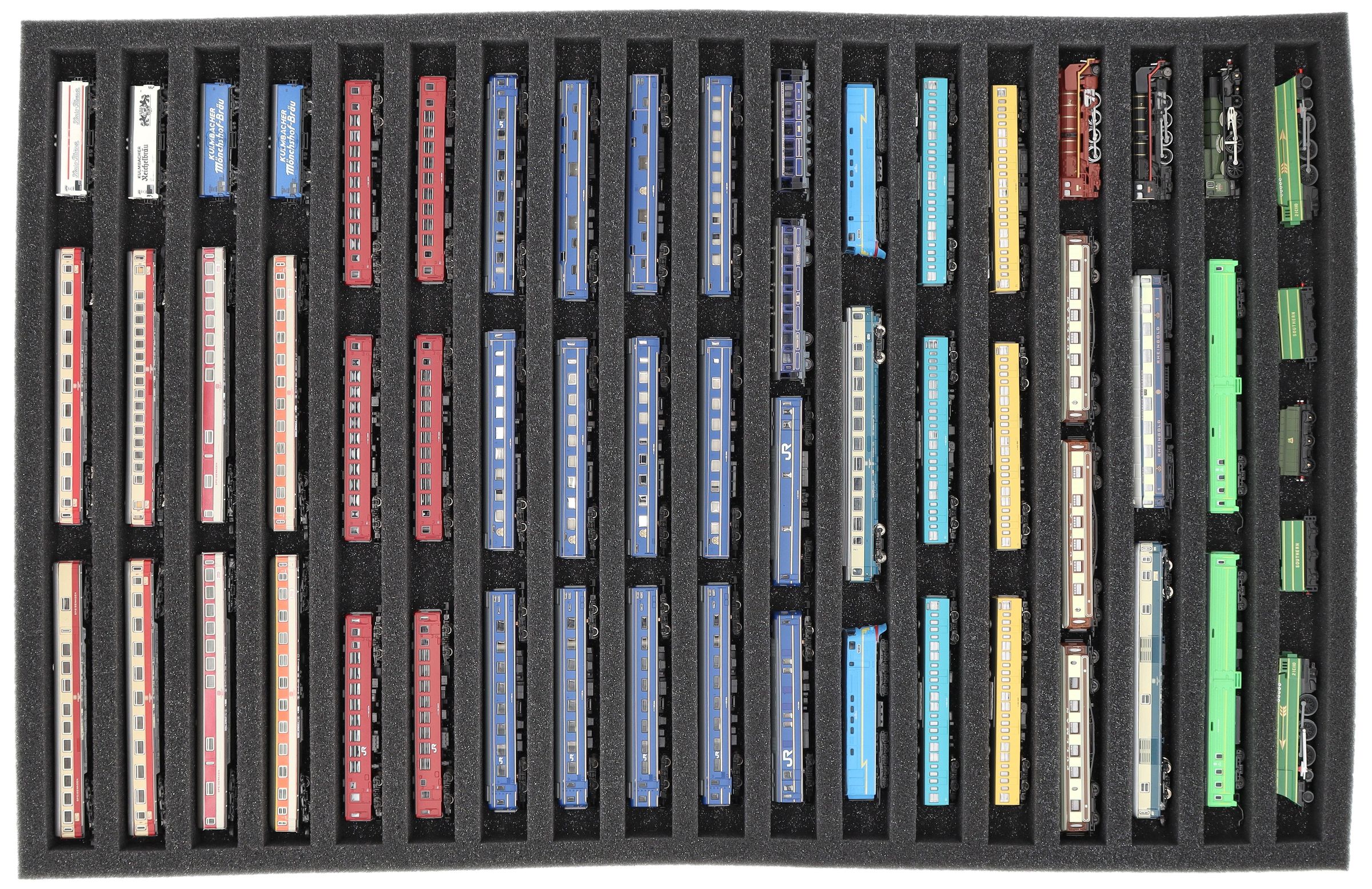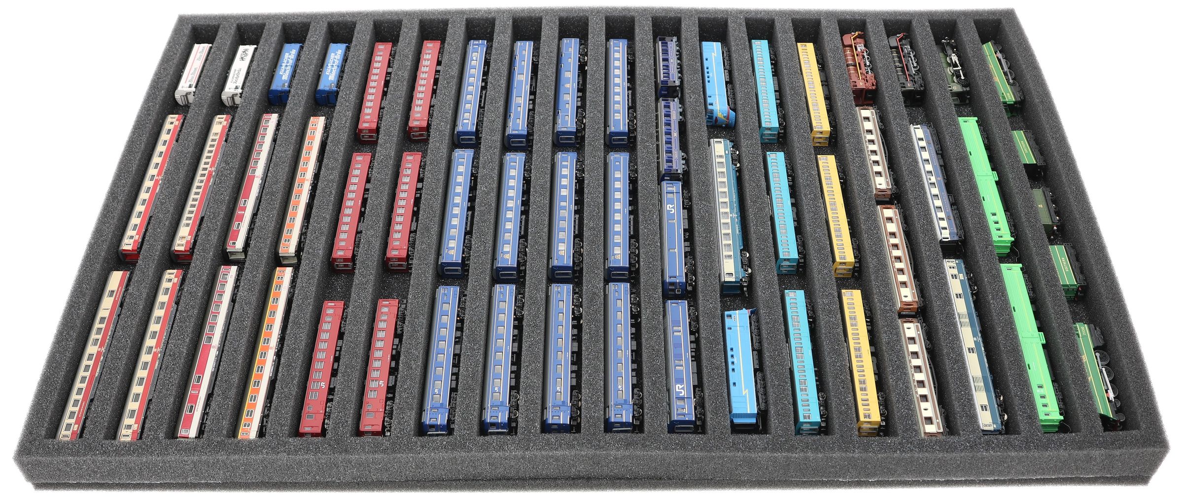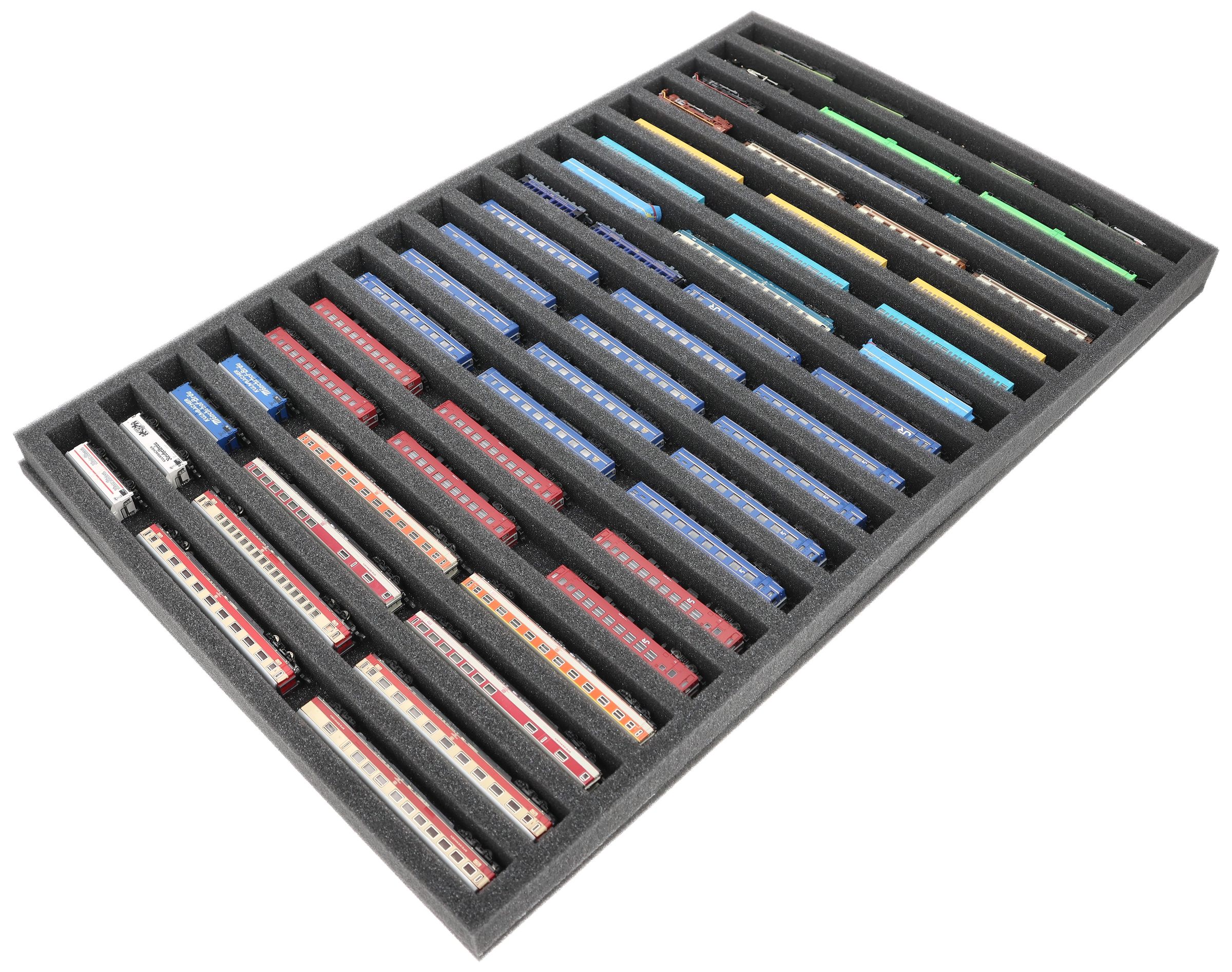 Whether for transport to exhibitions, module meetings, or safe storage on shelves at home, this insert keeps your Z scale locomotives and cars reliably protected. The 18 compartments hold the models horizontally and shield them from bumps and scratches.