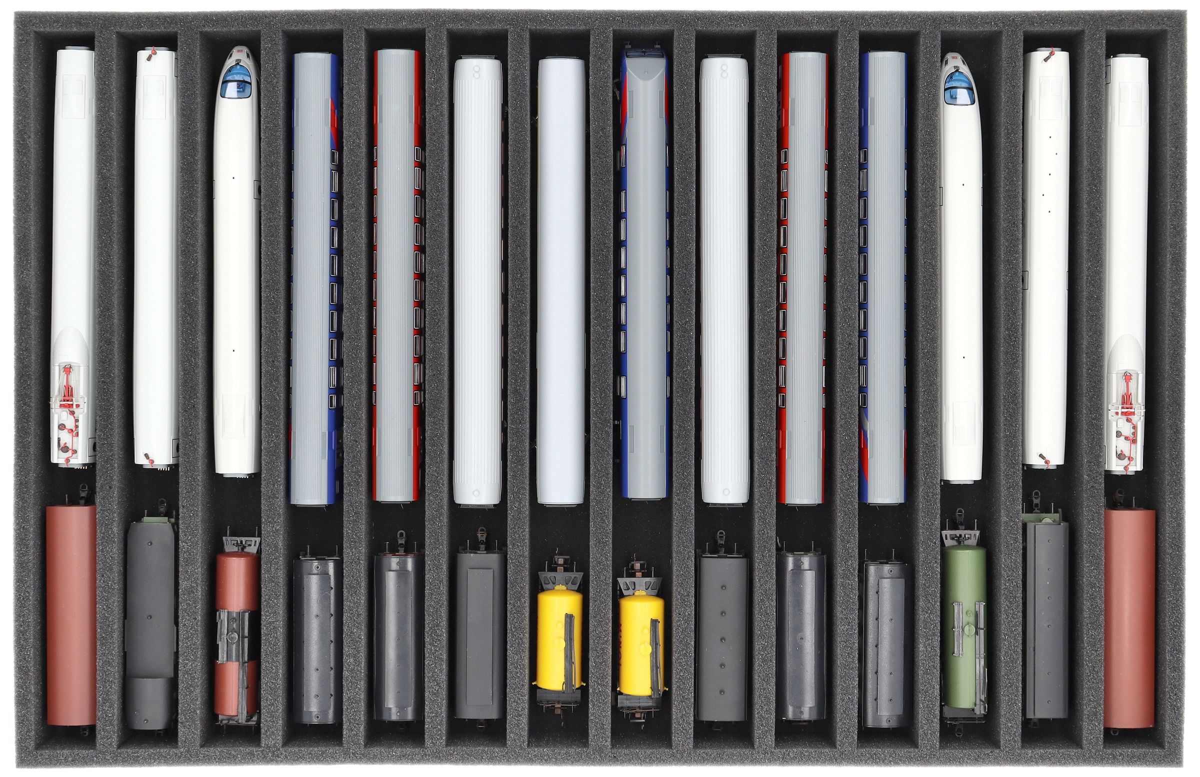 Whether for transport to exhibitions, module meetings, or safe storage on shelves at home, this insert keeps your TT scale locomotives and cars reliably protected. The 14 compartments hold the models upright and shield them from bumps and scratches.