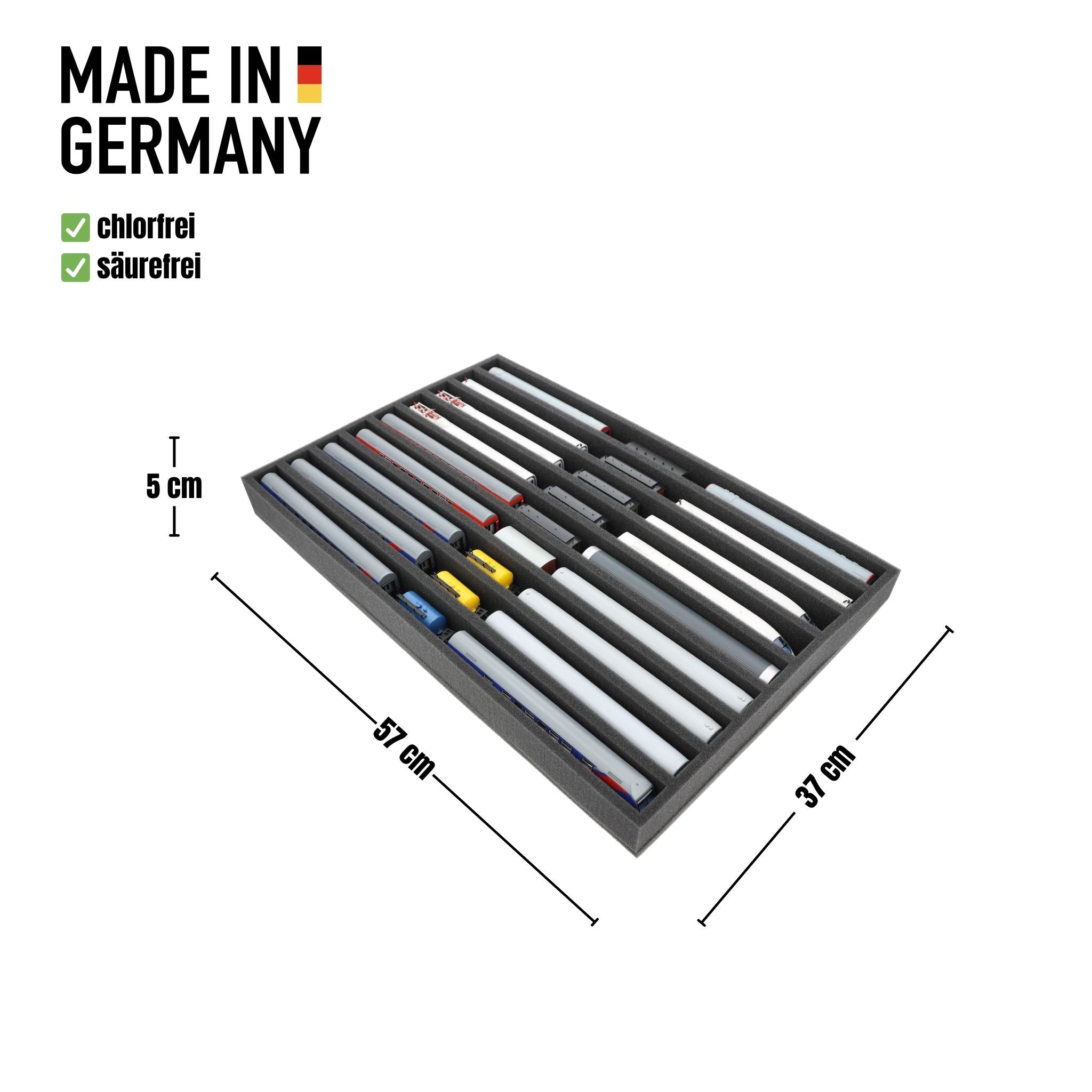 The foam insert has the dimensions: 570 mm x 370 mm x 50 mm total height (40 mm usable height + 10 mm foam base).
