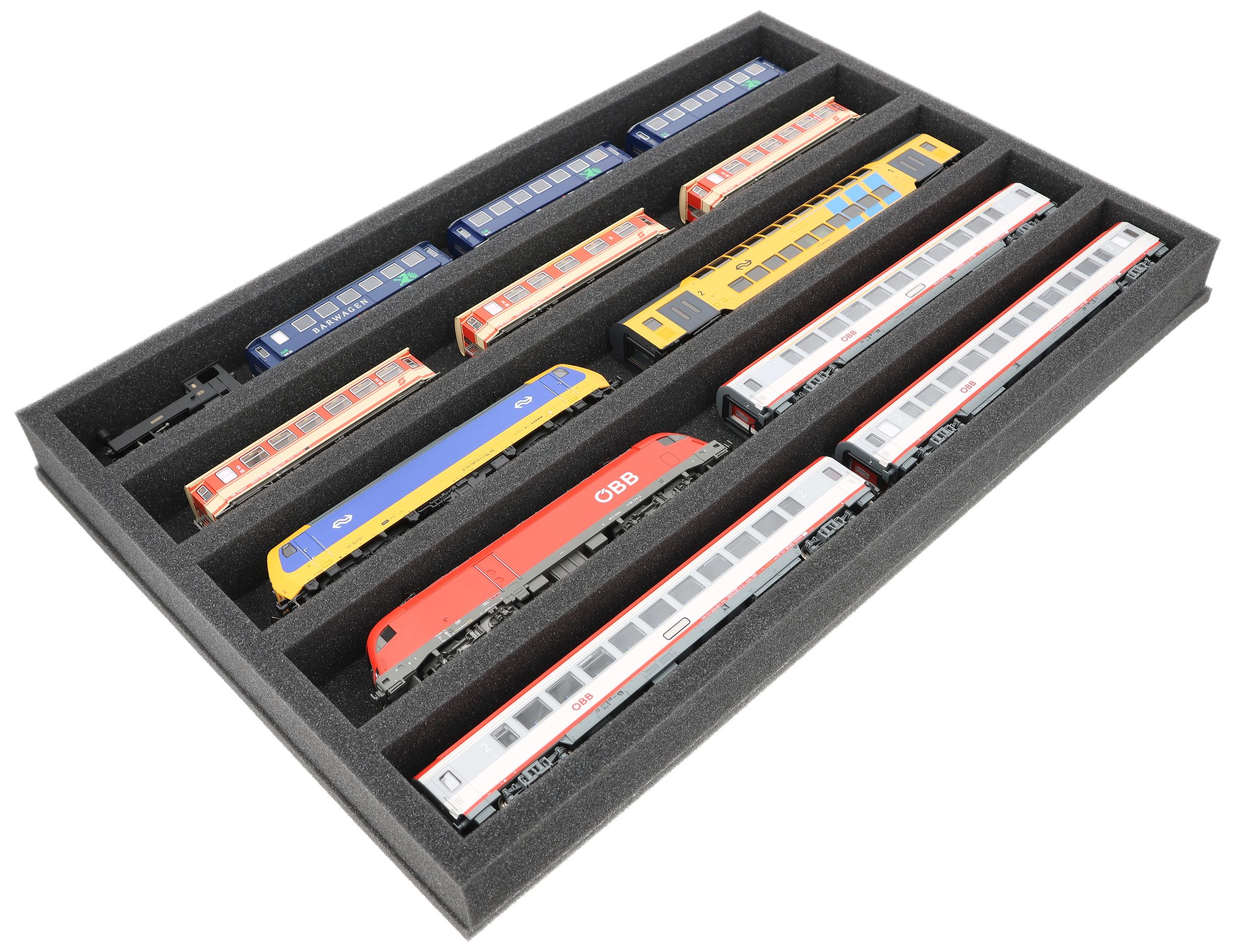 Whether for transport to exhibitions, module meetings, or safe storage on shelves at home, this insert keeps your H0 scale locomotives and cars reliably protected. The 5 compartments hold the models horizontal and shield them from bumps and scratches.