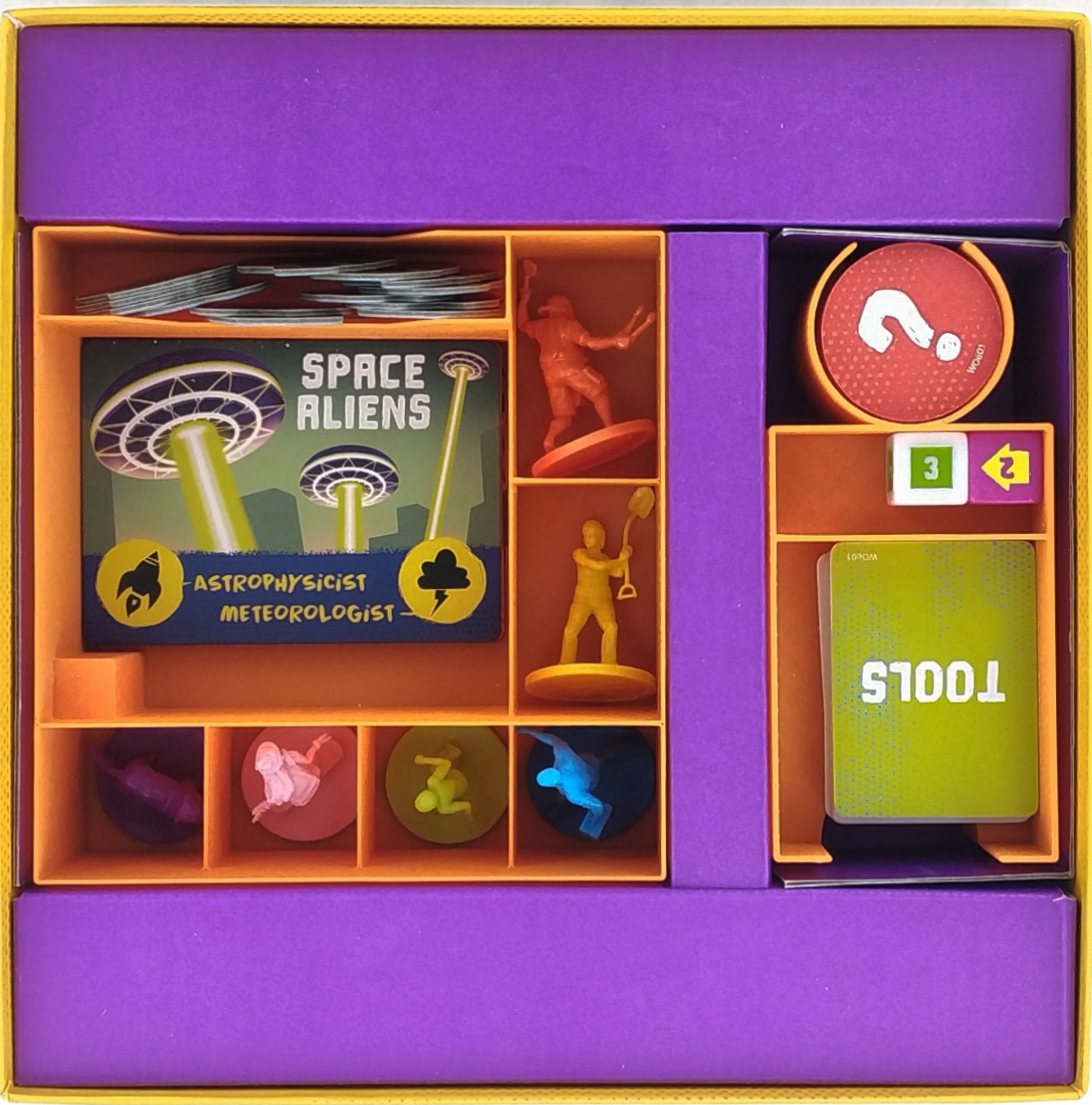• 1 plastic card holder with three compartments for small-format playing like tool cards + dice and science tokens