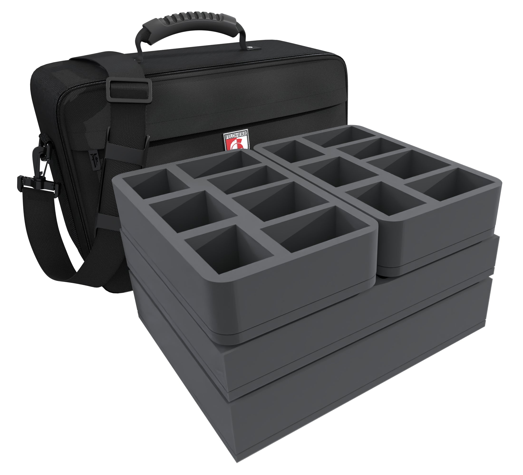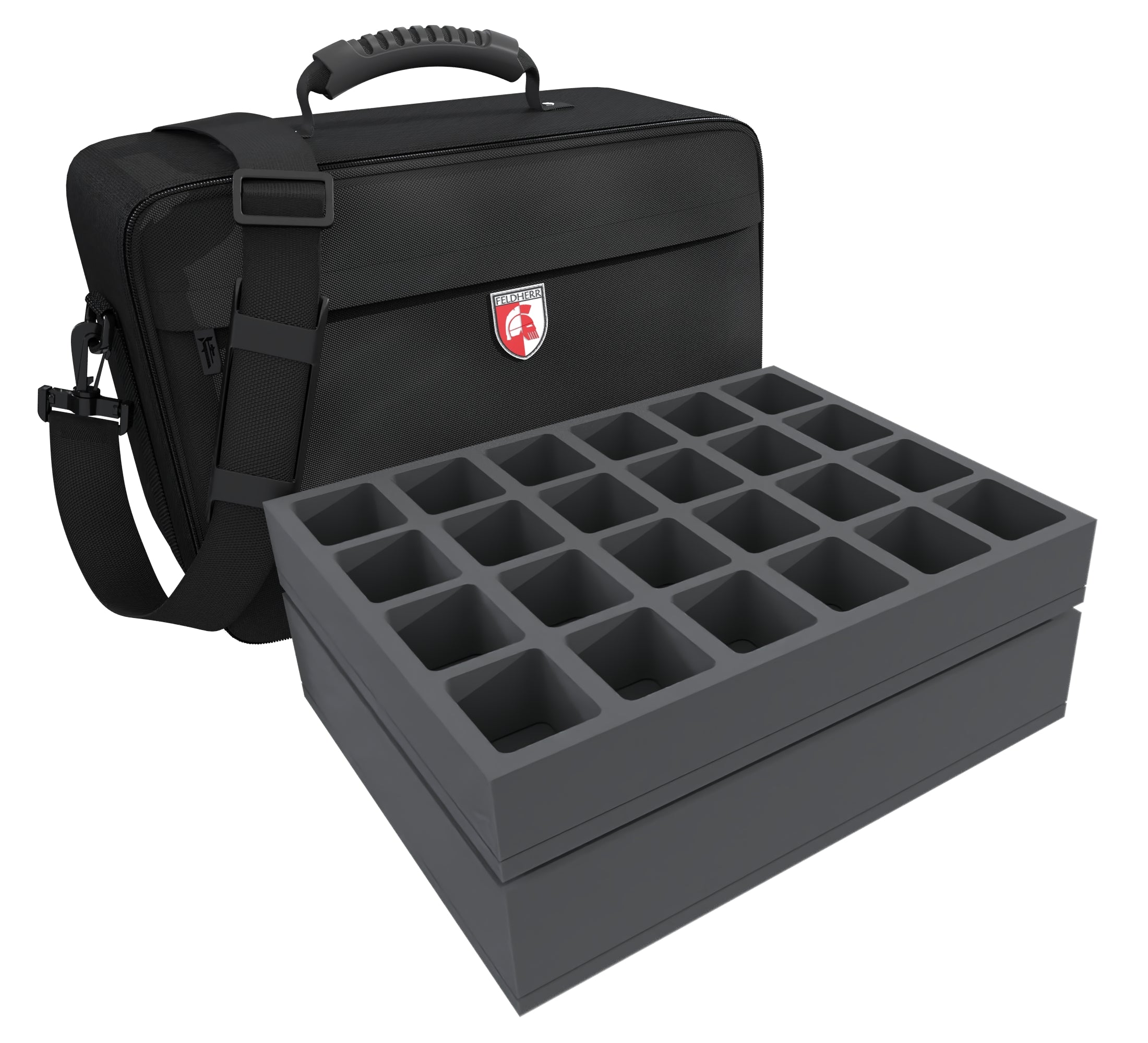 Of course, the inserts fit exactly into the sturdy MAXI bag. This is made of particularly hard-wearing material. Padded side panels and a reinforced base also ensure that your models are well protected from external influences, even when being transported by car or train. In addition to the large main compartment, the bag has a small zippered compartment at the front. There is a rubberized, handy carrying handle on the top. If you prefer to have your hands free, you can also use the bag as a shoulder bag thanks to the hard-wearing, detachable shoulder strap.