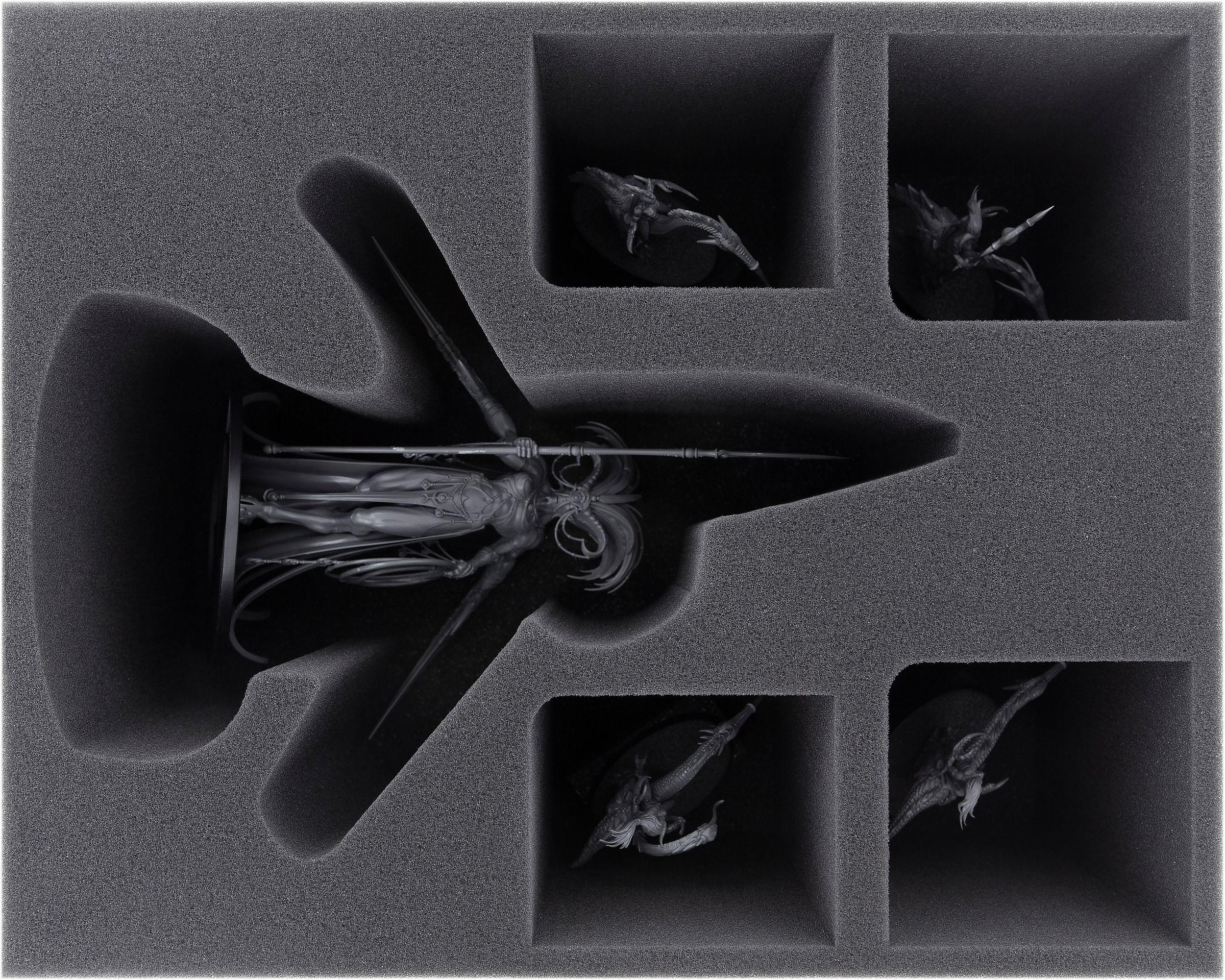 - 2 Full-Size foam trays, each with 4 compartments for e.g. Keeper of Secrets/ Shalaxi Helbane + bulky miniatures like Fiends, Infernal Enrapturess, bearers and musicians of the Daemonette (FSMEOG135BO)
