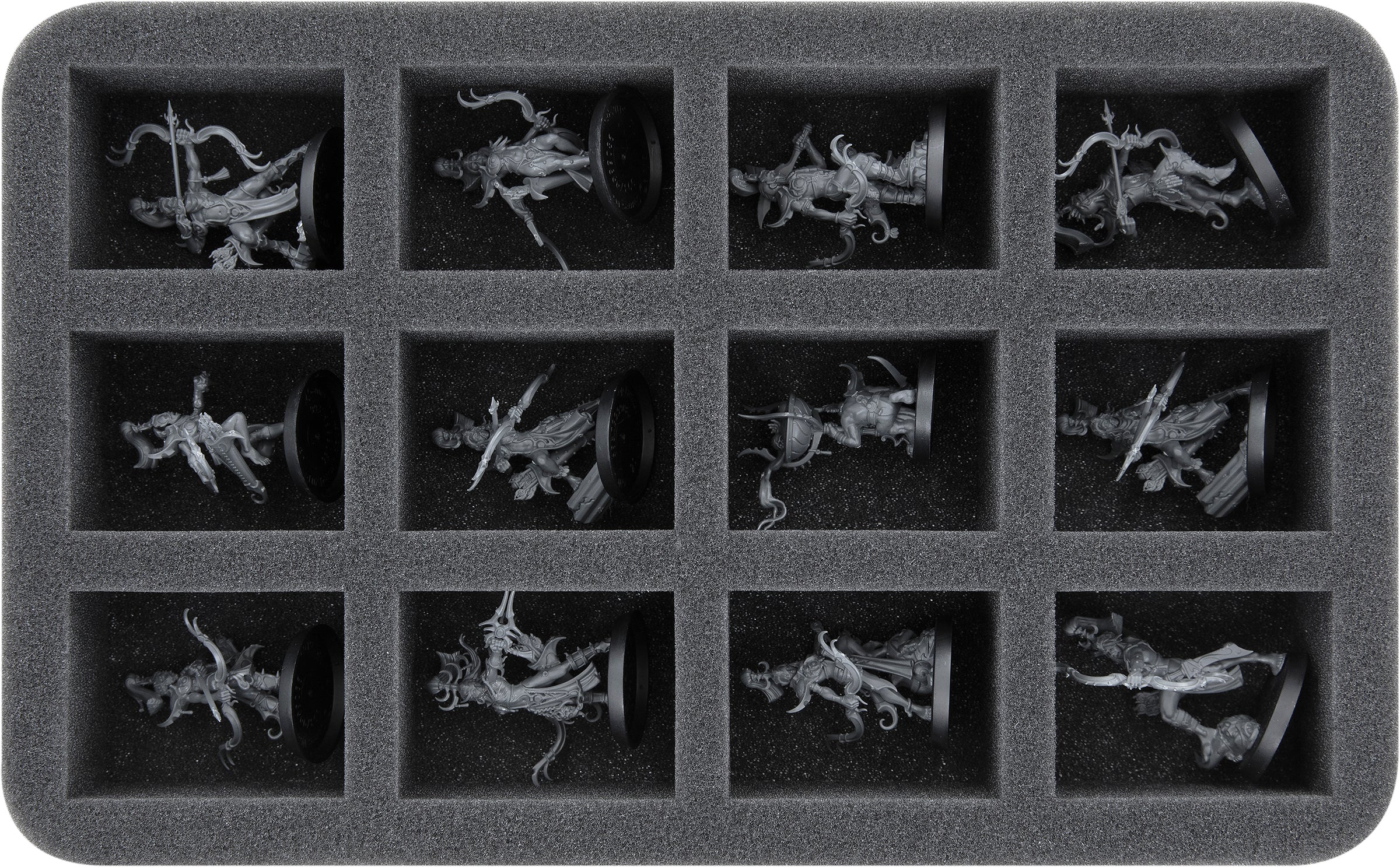 On this Feldherr foam tray you have space for up to 12 miniatures of your army. The insert is especially suitable for storing the Blissbarb Archers and similar sized models.