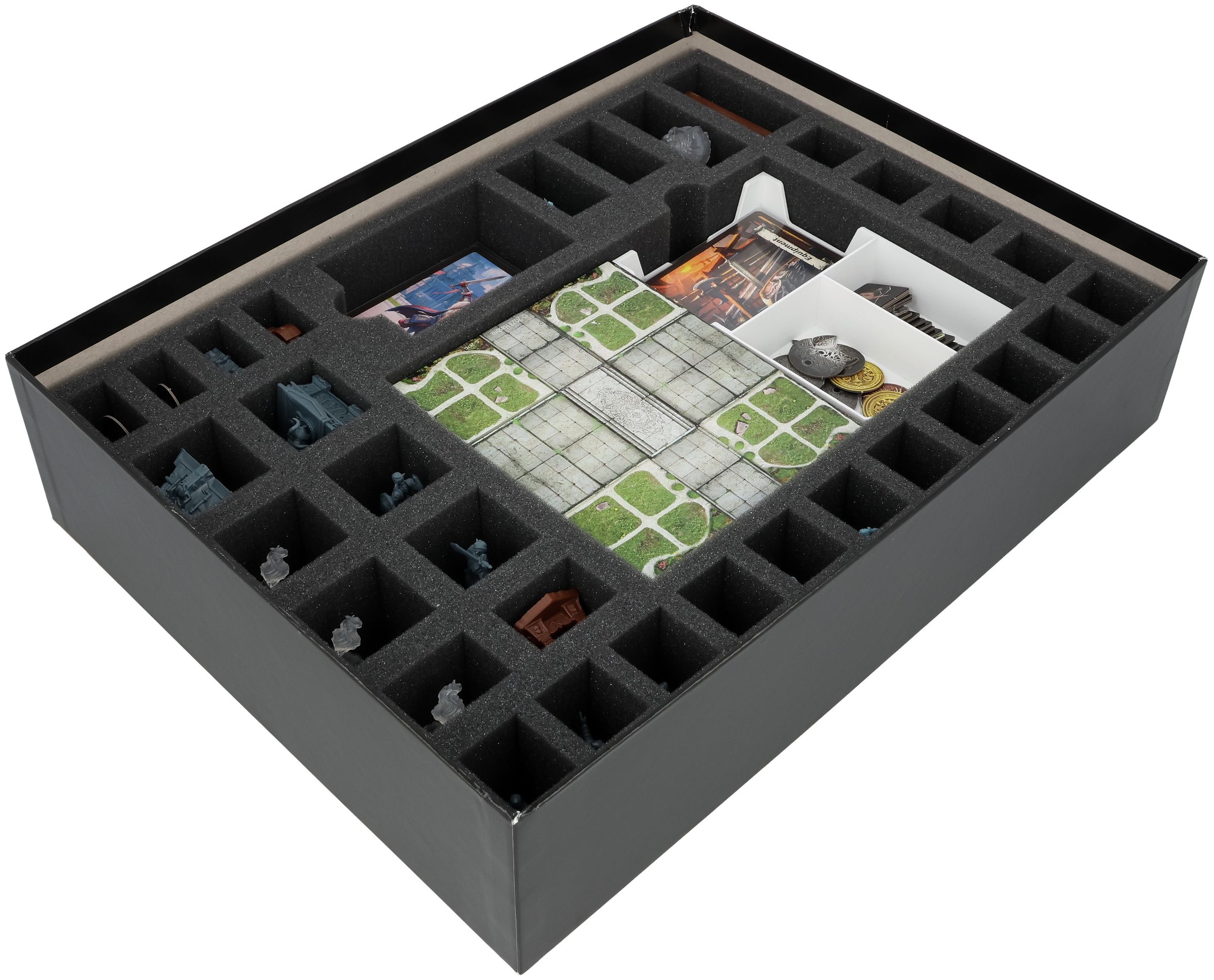 The Organizer Insert keeps your game material neatly organized. The tray is securely fixed in the large compartment with seven small foam mats.