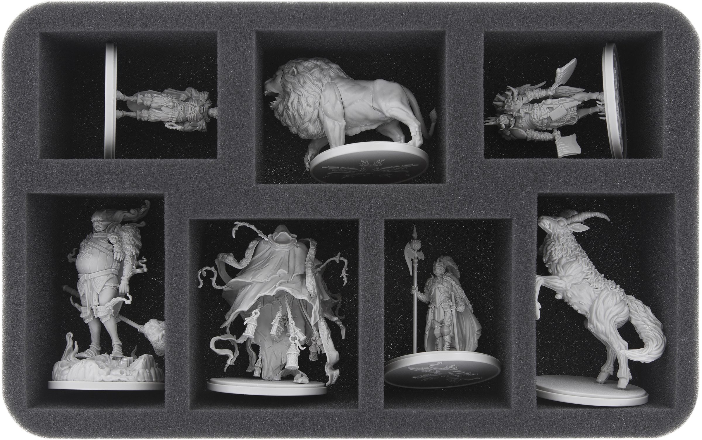 - 1 Half-Size foam tray with 7 compartments for bulky, medium-sized miniatures like Axerman Family, White Fang, Godhand, Smog Singers, and models with similar dimensions (HSLZ060BO)