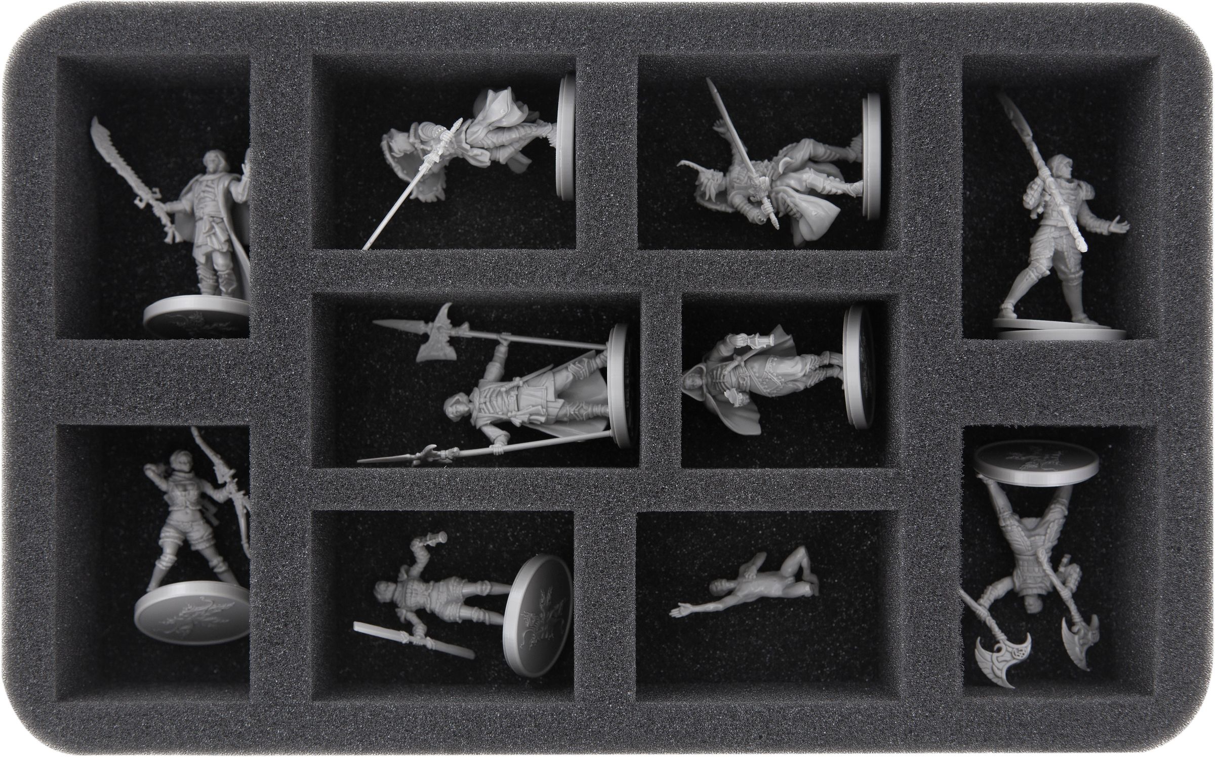 - 1 Full-Size foam tray with 22 compartments for expansive standard miniatures like Savage Bone Eaters, Champion of the Goblin, Neko Twilight Knight, Honorable Berserker, and models with similar dimensions (FSMEZZ050BO)