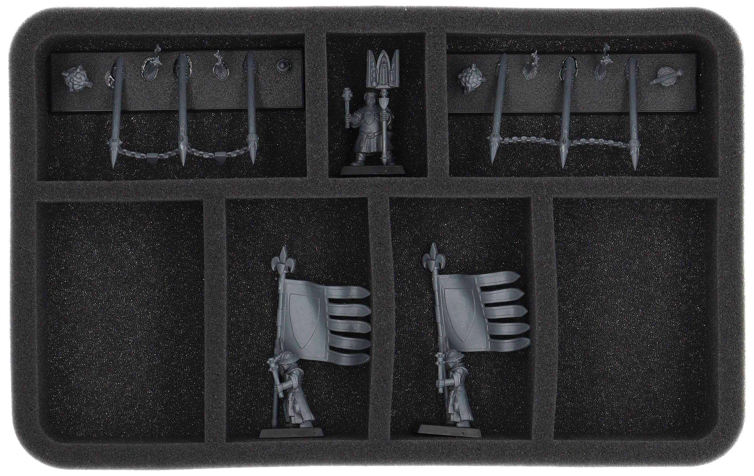 On this Feldherr foam tray you have space for up to 7 miniatures of your army. The insert is especially suitable for storing the Woden Stakes of the Bowmen, Standard Bearers, Monk and similar sized models.