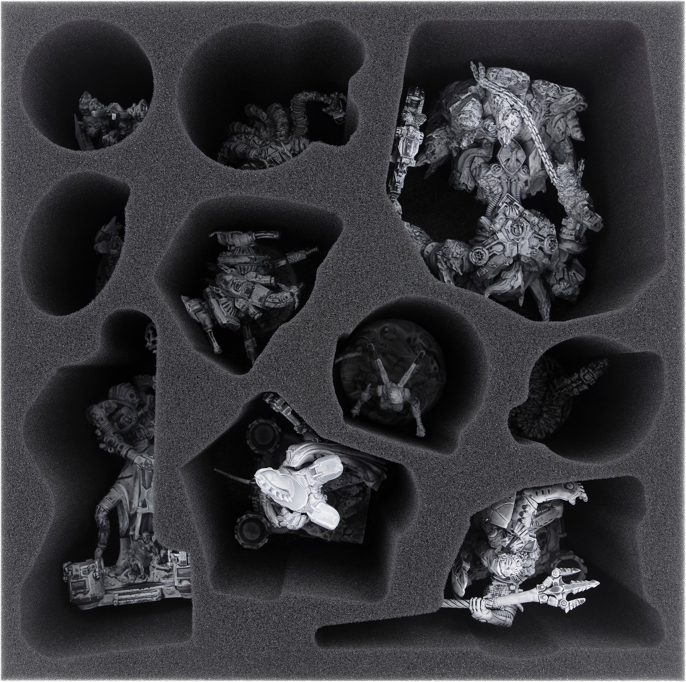 On the high foam tray you store the large figures in miniature-precise cut compartments.