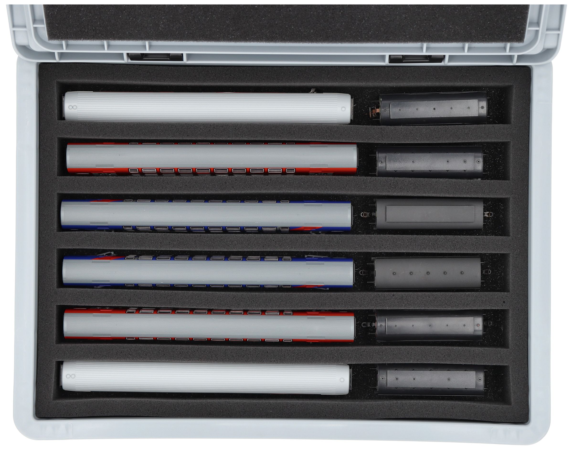 The 6 equal-sized compartments (each approx. 340 x 30 x 40 mm) are specially designed for TT scale models. Depending on their length, several wagons or locomotives can be placed side by side. The exact fit ensures that the models are securely fixed and do not slip during transport.
