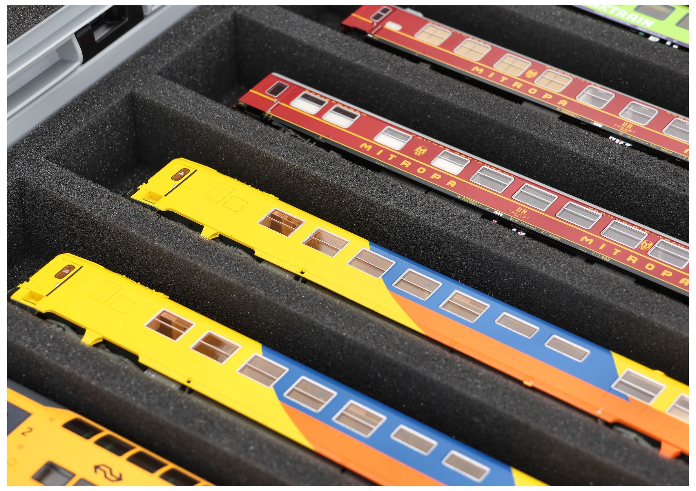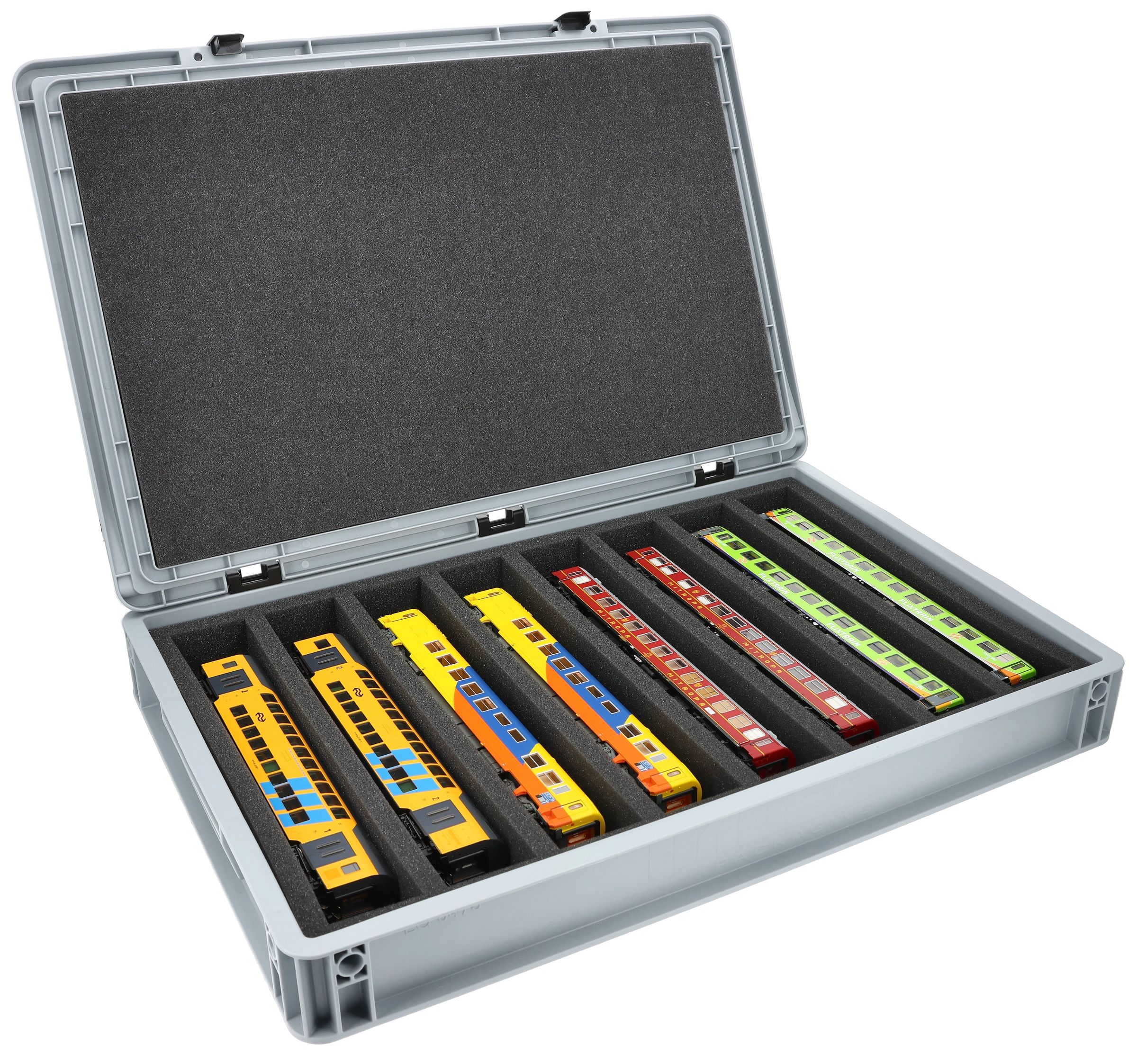 Die 8 gleich großen Fächer (je ca. 320 x 55 x 40 mm) sind speziell für Modelle der Spur H0 ausgelegt. Je nach Länge lassen sich Lokomotiven und Waggons nebeneinander platzieren. Die exakte Passform sorgt dafür, dass die Modelle sicher fixiert sind und beim Transport nicht verrutschen.