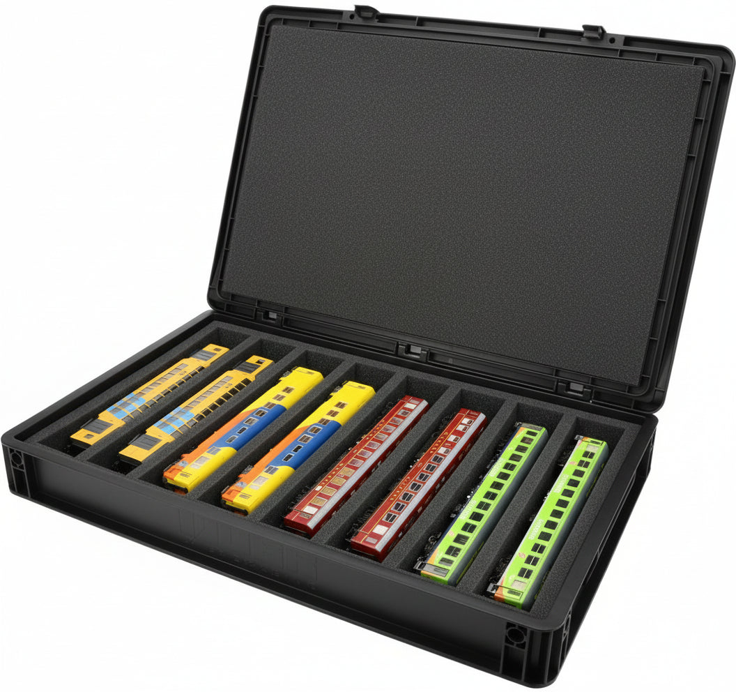 Für alle, die ihre Spur H0 Loks, Waggons und Fahrzeuge sicher und kompakt transportieren möchten: Dieses Feldherr Set kombiniert eine stapelbare Eurobox mit maßgeschneiderter Schaumstoffeinlage. Ob für die Fahrt zum Eisenbahner-Stammtisch, Modultreffen oder als platzsparende Lagerlösung daheim - deine Modelle sind jederzeit gut geschützt.