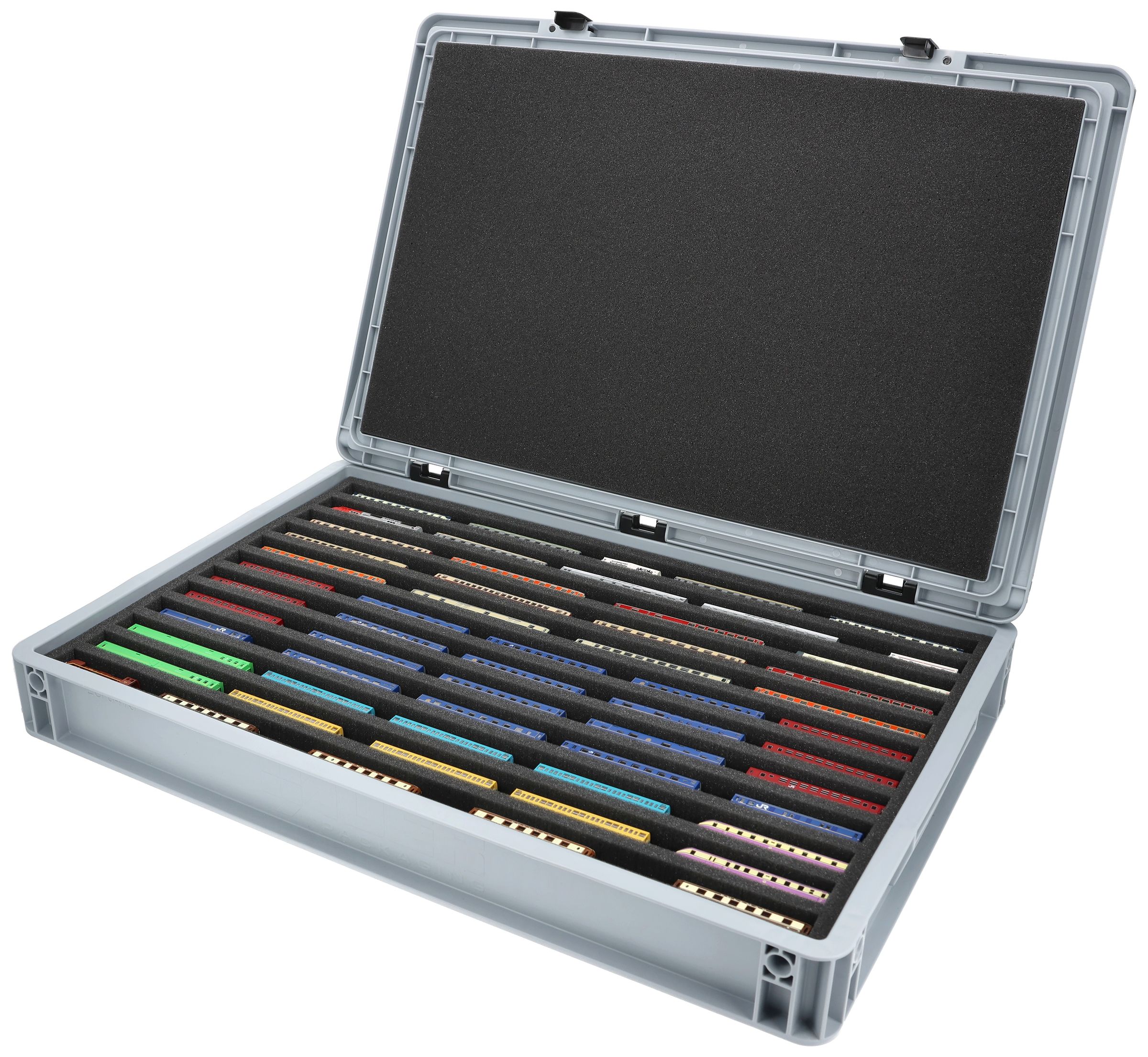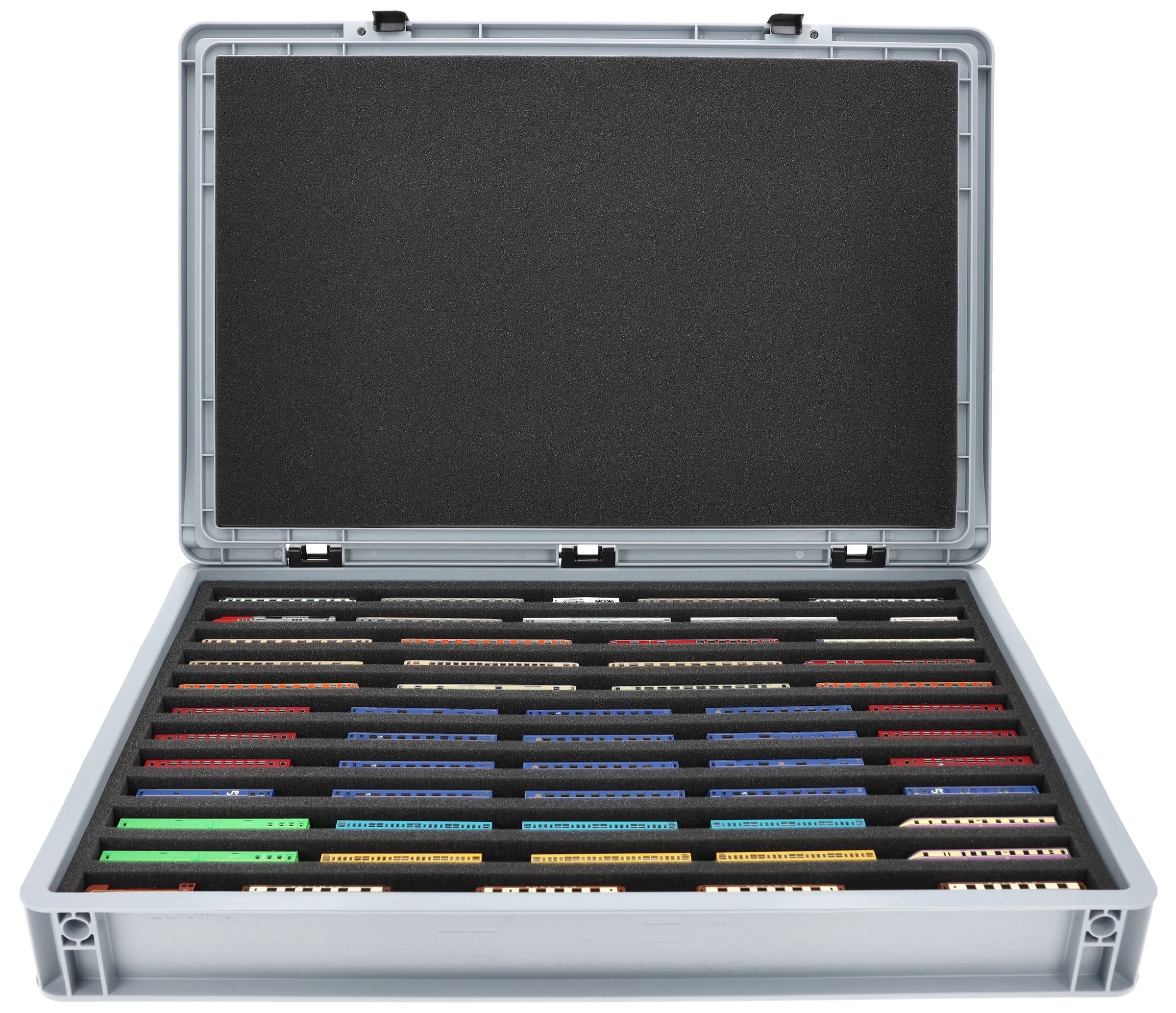 The 12 equal-sized compartments (each approx. 550 x 20 x 20 mm) are specially designed for Z scale models. The horizontal position keeps pantographs and delicate parts protected while ensuring the models stay stable during transport.