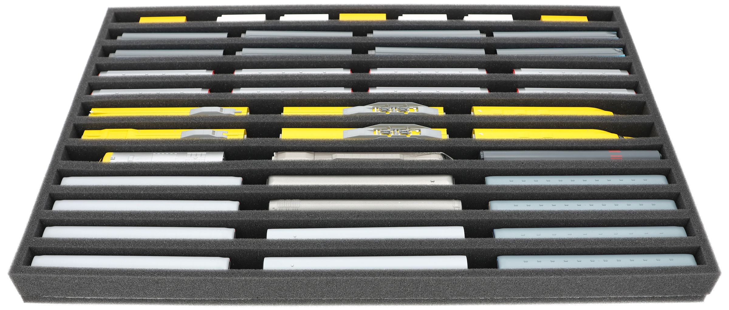 Whether for transport to exhibitions, module meetings, or safe storage on shelves at home, this insert keeps your N scale locomotives and cars reliably protected. The 12 compartments hold the models upright and shield them from bumps and scratches.