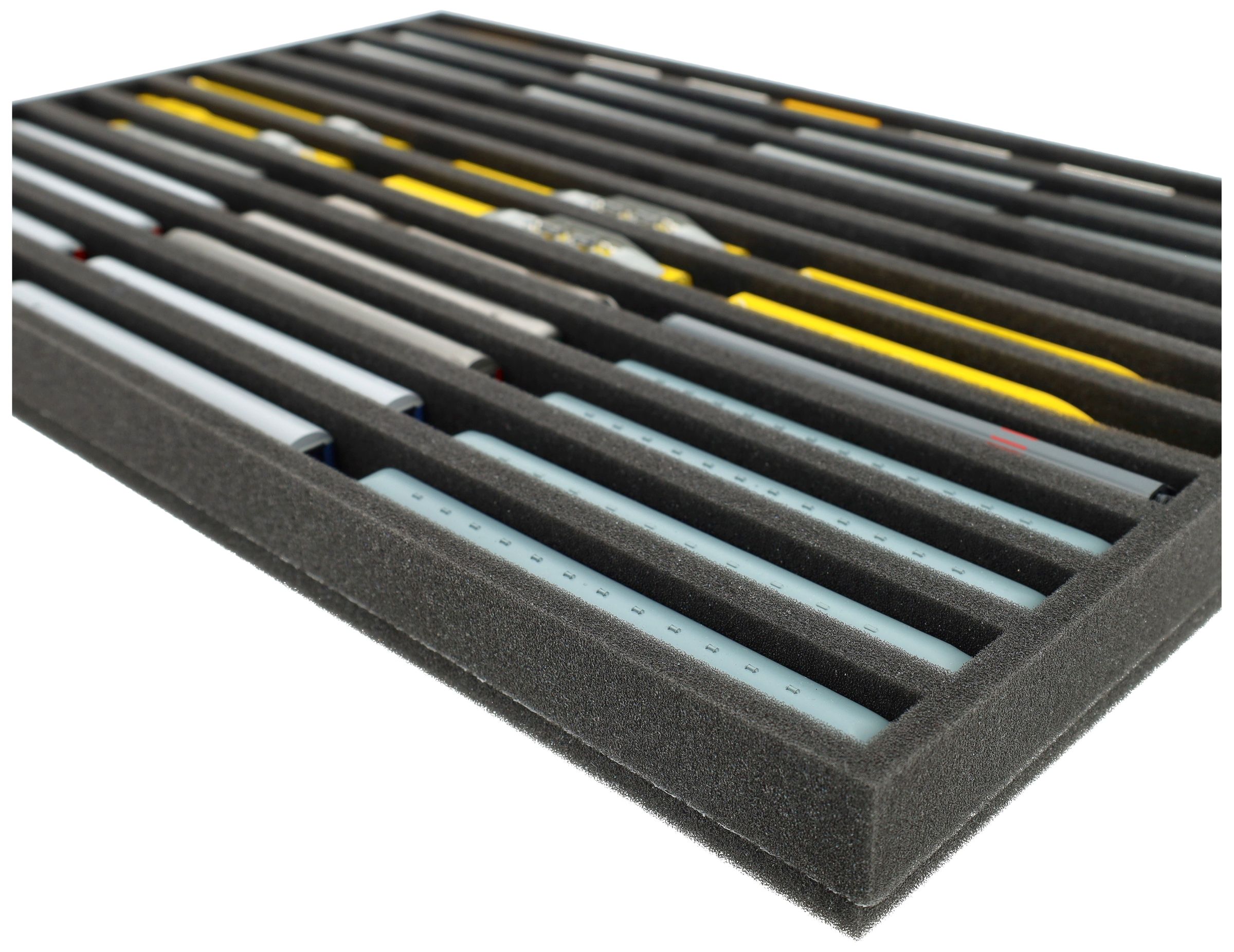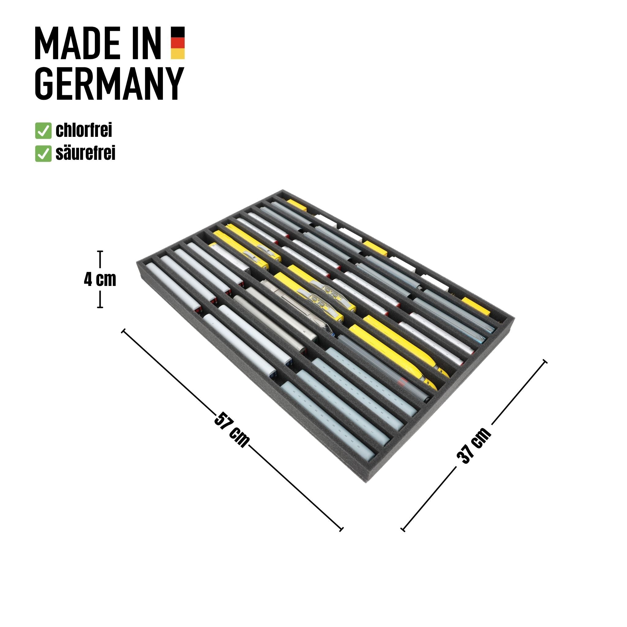 The foam insert has the dimensions: 570 mm x 370 mm x 40 mm total height (30 mm usable height + 10 mm foam base).