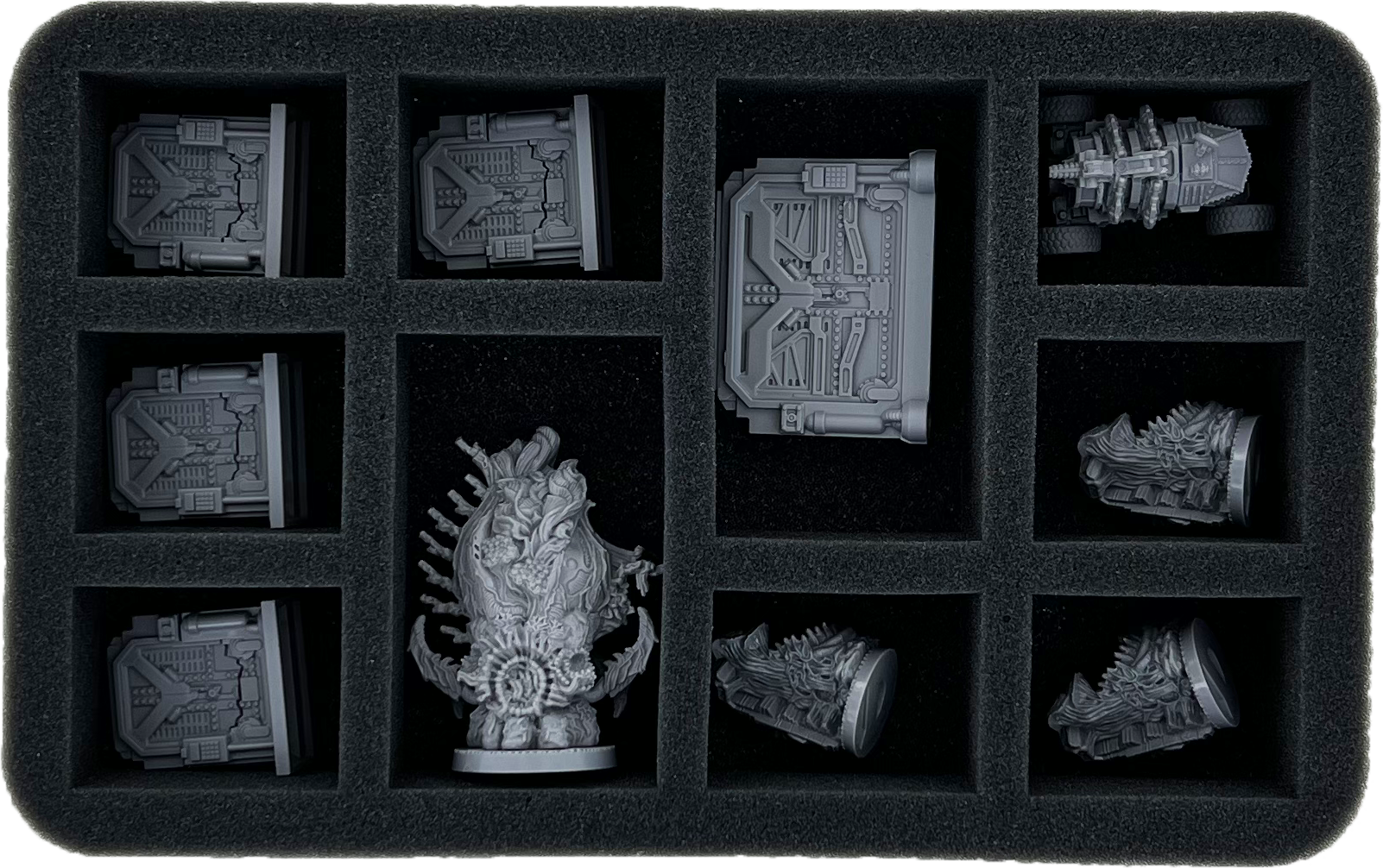 - 1 Half-Size foam tray with 10 compartments for miniatures of different sizes like the Landrover, Doors, Double Bulkhead Door, Chytrids Archeri, Chytrids Queen (HSMEFF045BO)