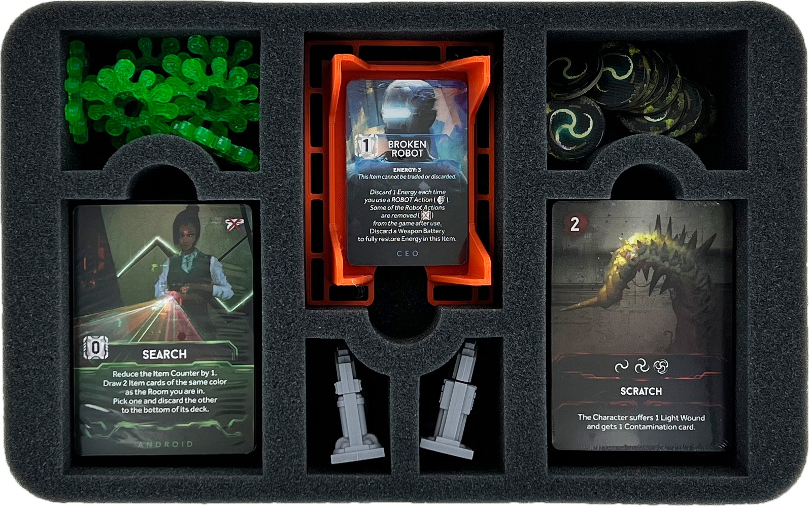- 1 Half-Size foam tray with 7 compartments + 1 plastic card holder with one compartment for small and normal sized cards + small game material + small miniatures (HSMEQO050BO + 62358)
