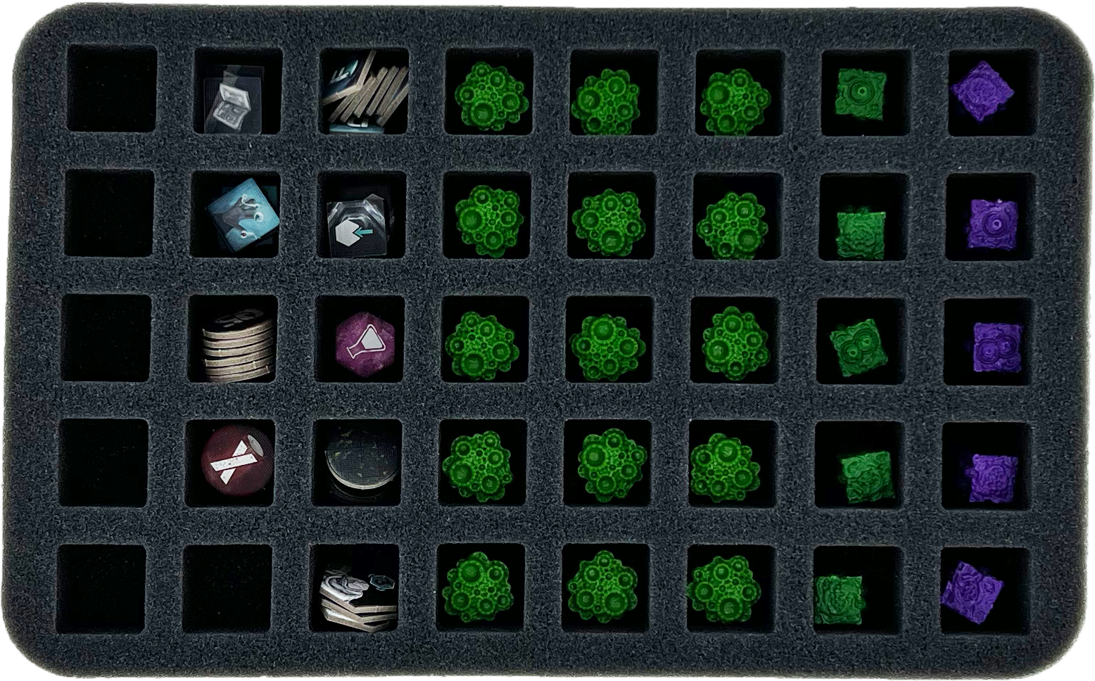 - 1 Half-Size foam tray with 40 quadratic compartments for small-sized game material like Chytric Spore Acrylic Tokens, cardboard tokens + small miniatures like Saprobes Models (HSHM030BO)