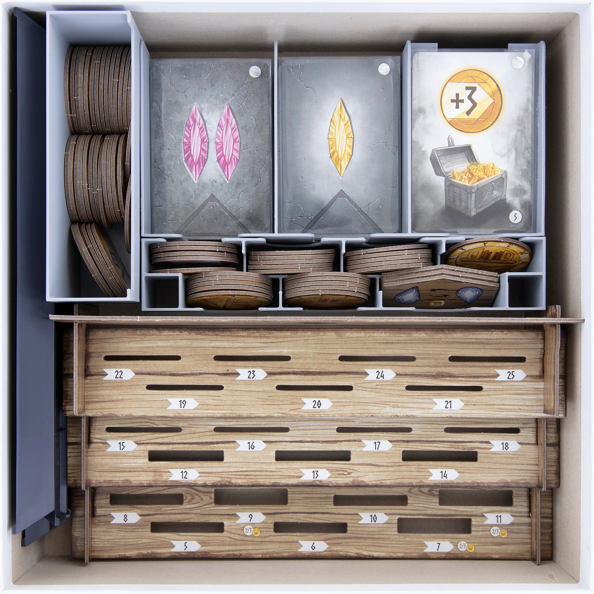 • 1 card holder with 5 compartments for game cards like Dwarf cards, Distinction cards, Royal Offering cards and Hero cards.